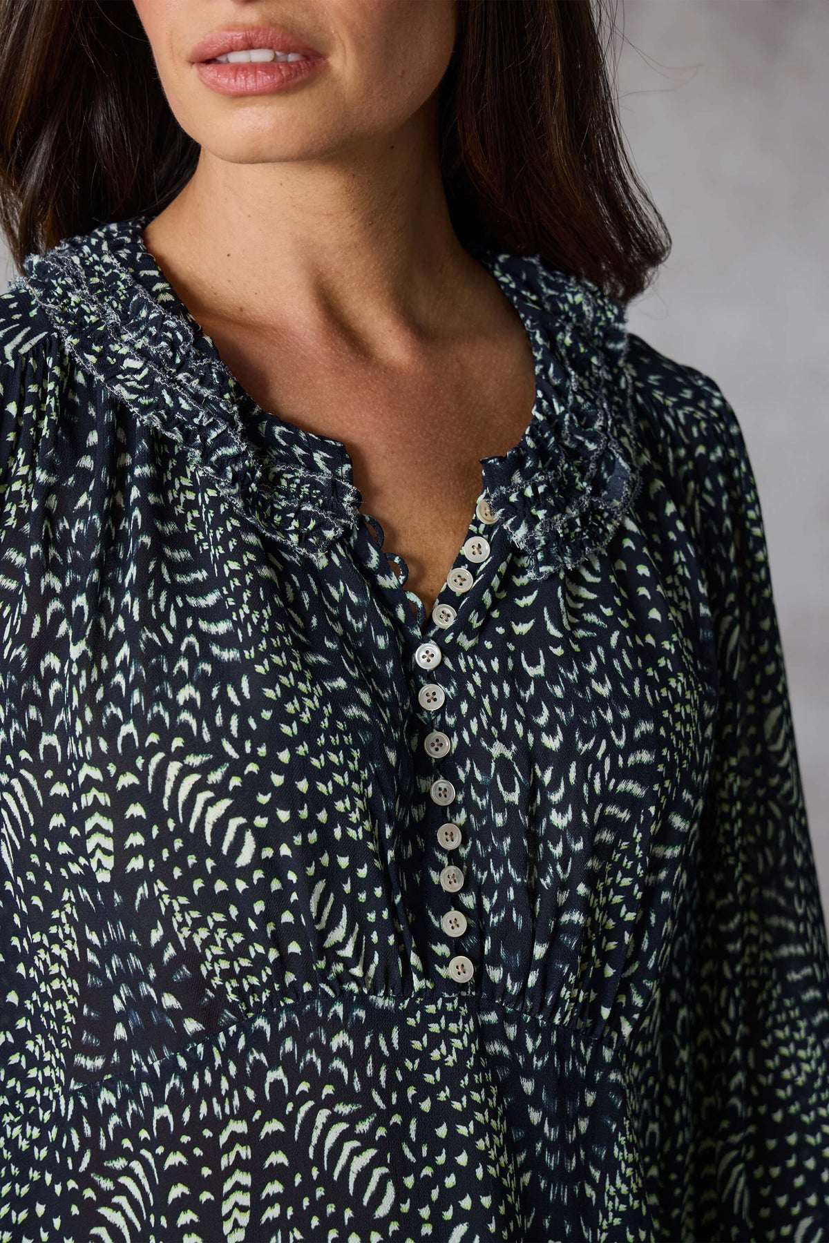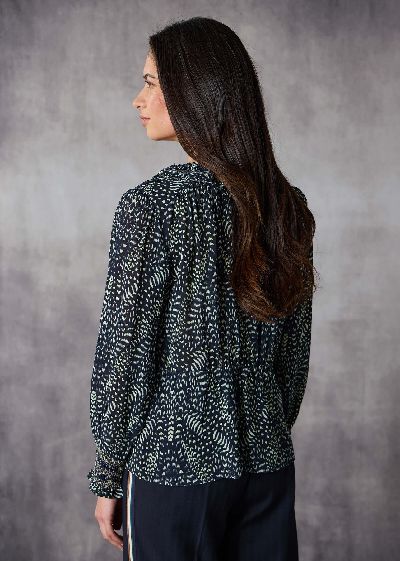 Santiago Top is based from our best seller - Lottie Top with longer sleeves, a perfect piece to dress up in Winter. The Animal print top featuring a soft ruffle detailing on the collar and delicate buttons add a romantic touch. Finished with sleeves adorned in shirred ruffle cuff.