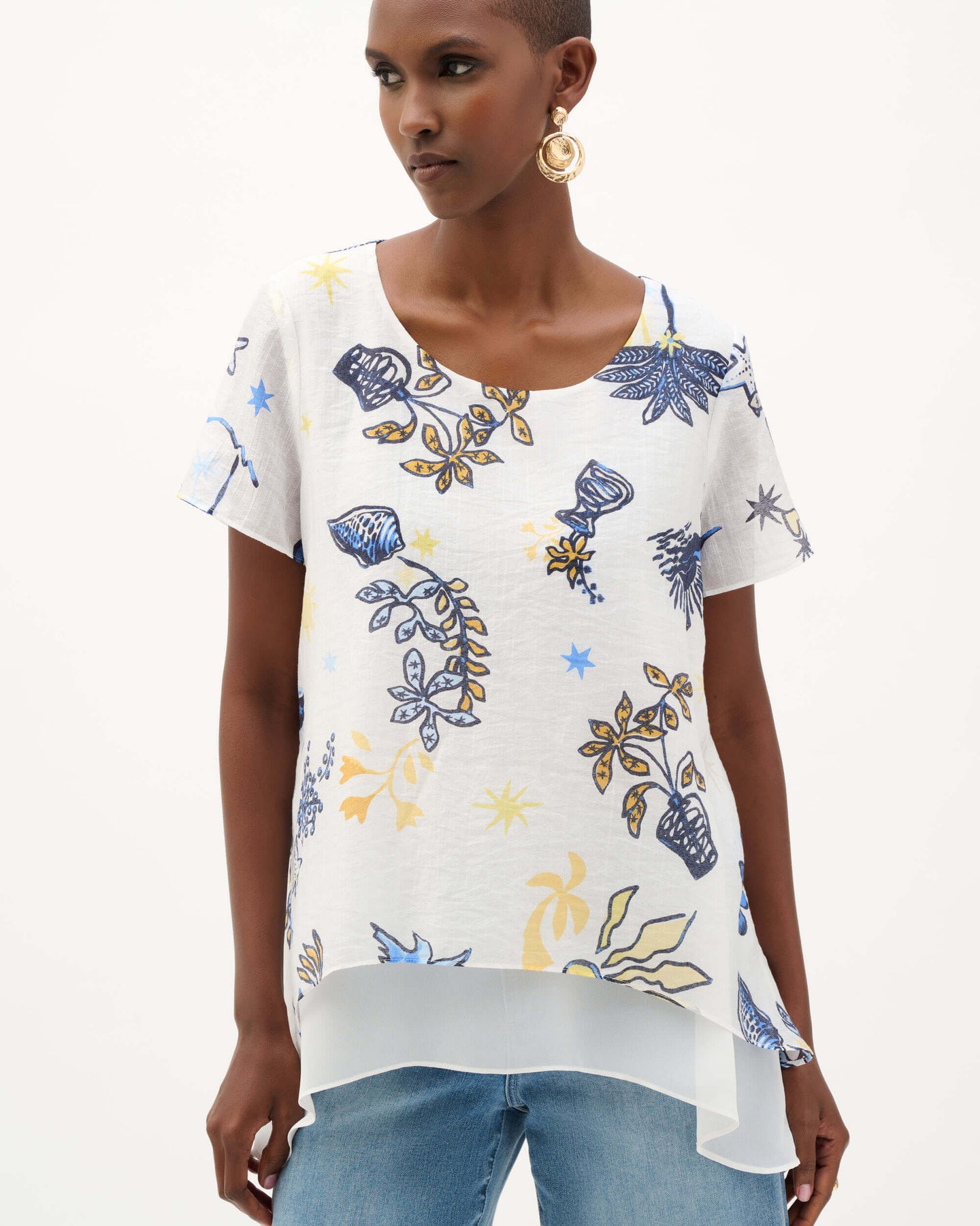 Short sleeves and a soft scoop neckline shape this tropical print trapeze tunic. Sheer woven fabric layered over chiffon creates light movement, giving the silhouette a breezy feel that’s refined enough for everyday wear.