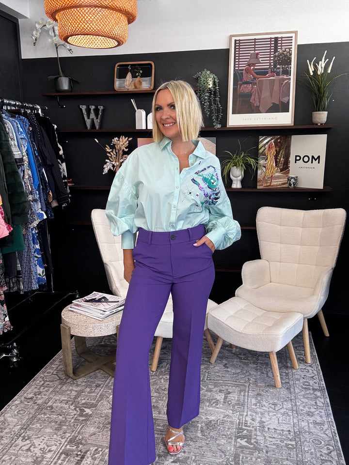 Made of 100% organic cotton, this blue blouse features elegant embroidery on the shoulder, finished with sequins.