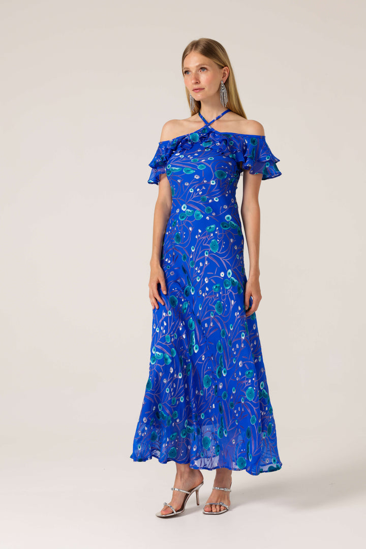 The stunning Blue Bird Bias Dress features a vibrant blue base adorned with an intricate floral pattern. The off-shoulder design beautifully highlights the shoulders, complemented by delicate ruffle sleeves. A unique crisscross halter neck adds an element of modern elegance, while the flowing maxi length creates a graceful silhouette. Perfect for weddings, parties, or casual outings, it pairs effortlessly with heels and accessories for a complete, show stopping look.