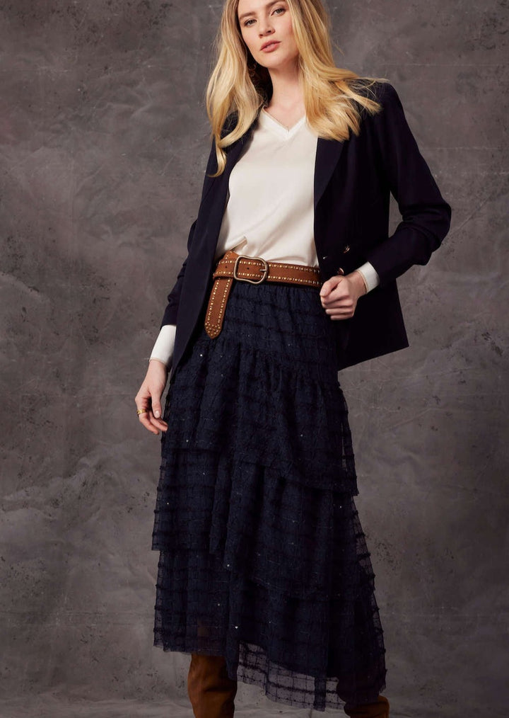 Tulle skirt with layered tiers, featuring sequin highlights, and a velvet elastic waist band. Fully lined