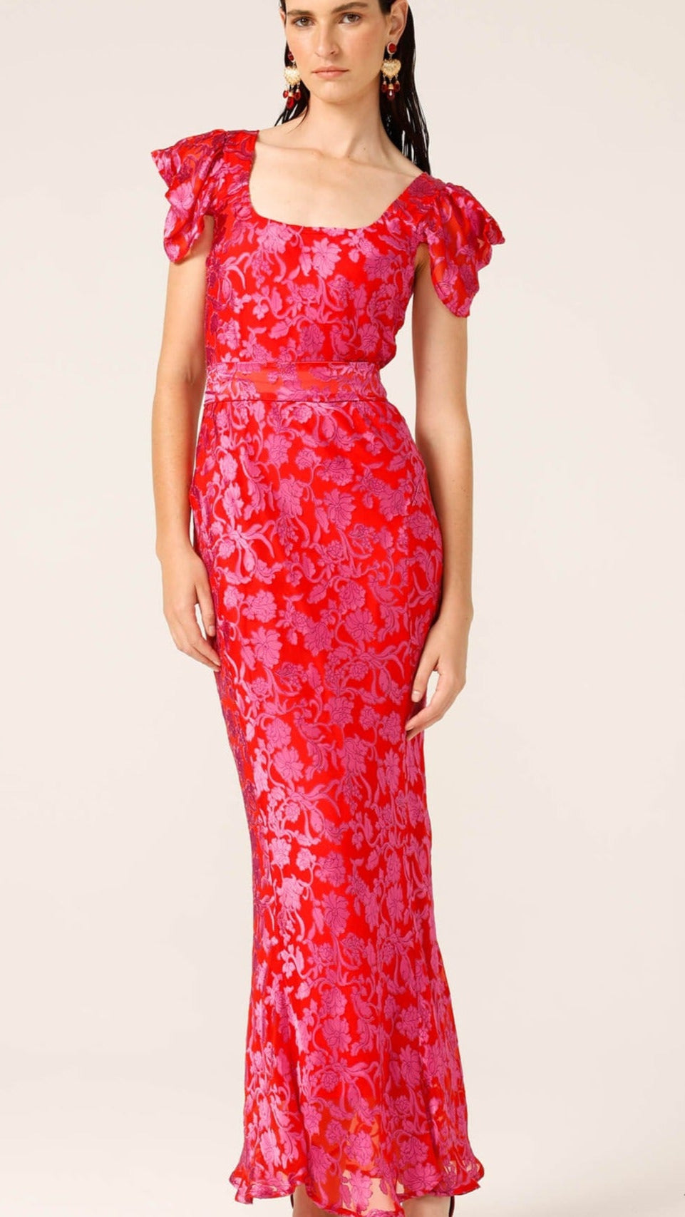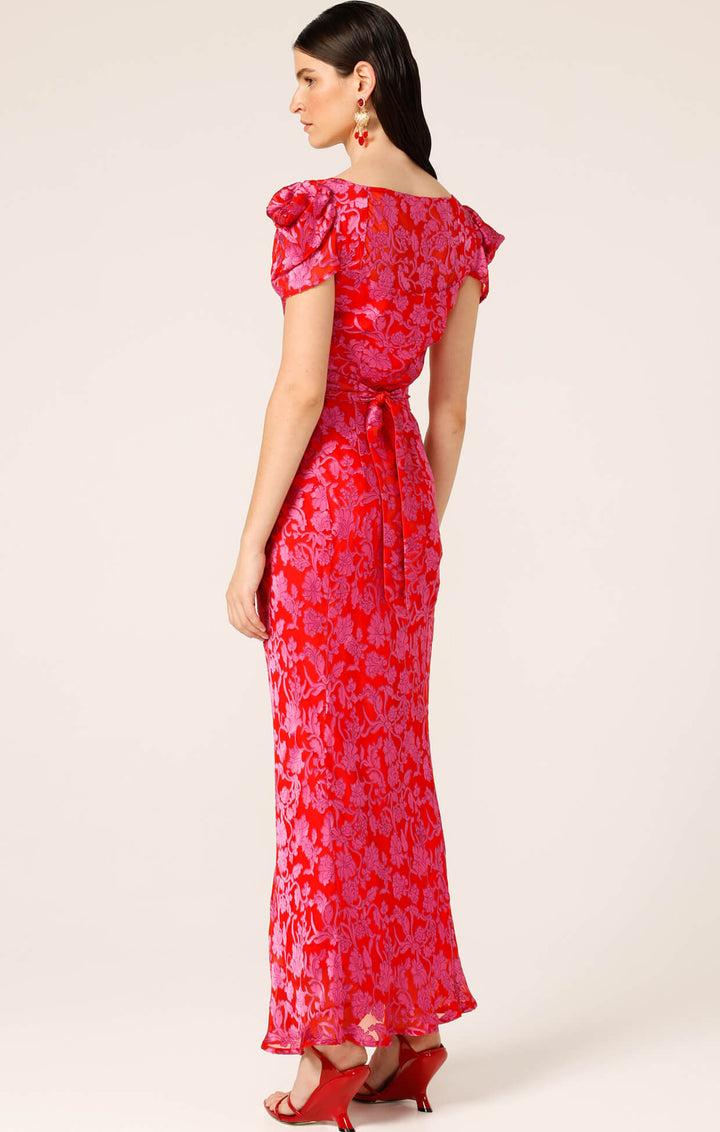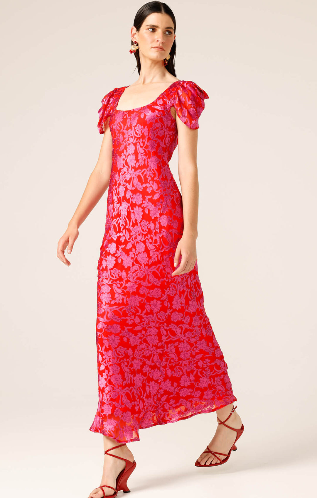 The Firebird Dress embodies Autumn elegance and brings a pop of colour to the darker months. Made from a lightweight silk rayon burnout fabric, the ankle length dress features draped cap sleeves in a bias cut fitted silhouette that finishes in a slight mermaid hem. It is the perfect party piece for a formal occasion. We will be wearing bright accessories to bring out the gorgeous pink red floral print!
