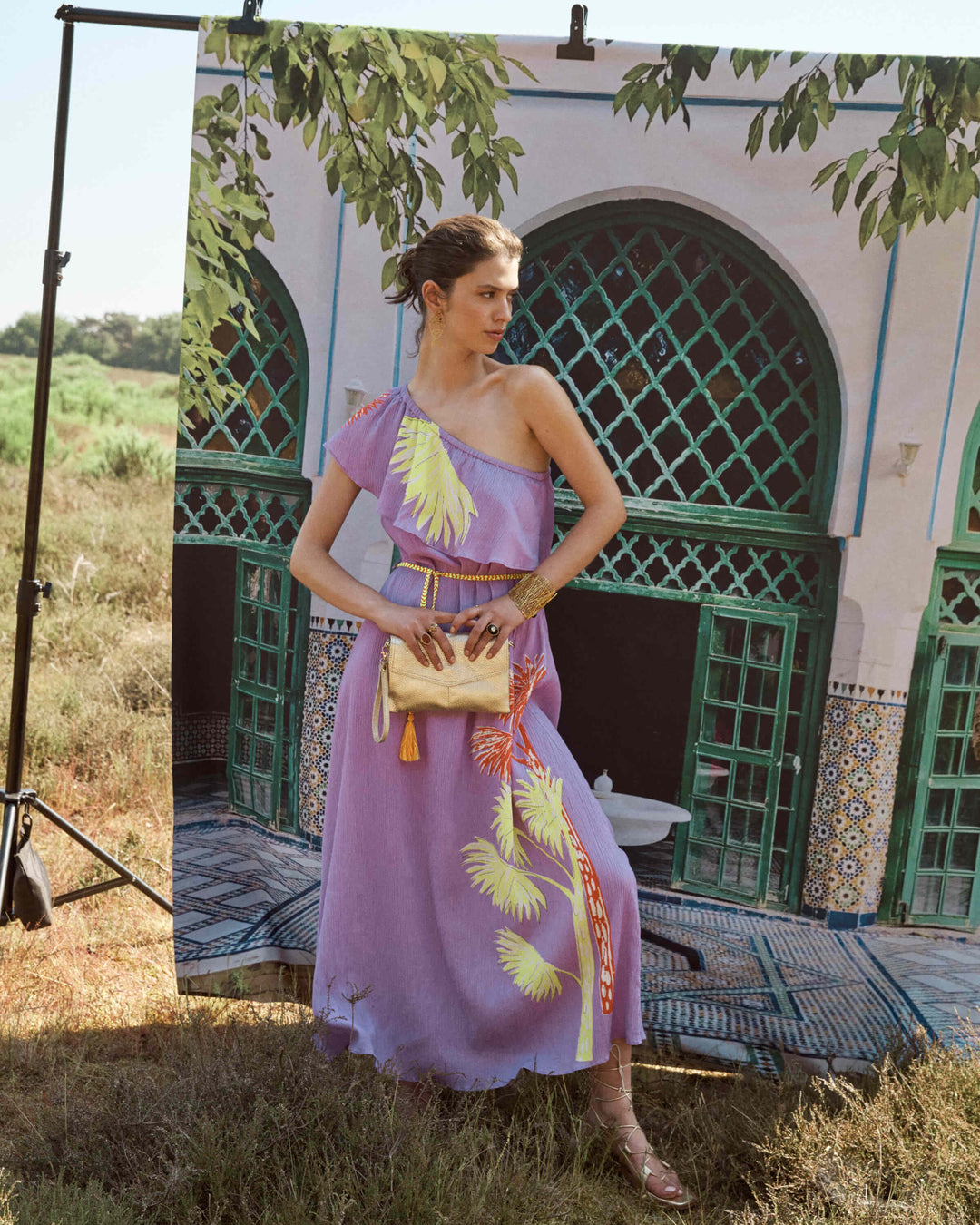 This purple dress has a handmade element inspired by the iconic gardens of Marrakesh. The dress has an elegant one-shoulder, finished with ruffles and a detachable tie belt at the waist. Thanks to the use of LENZING™ ECOVERO™ fabric, the dress fits smoothly and the item is 'more sustainable'.