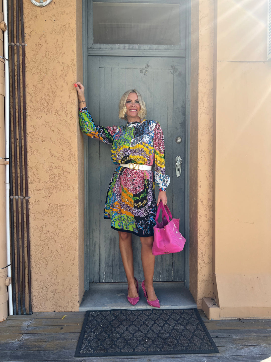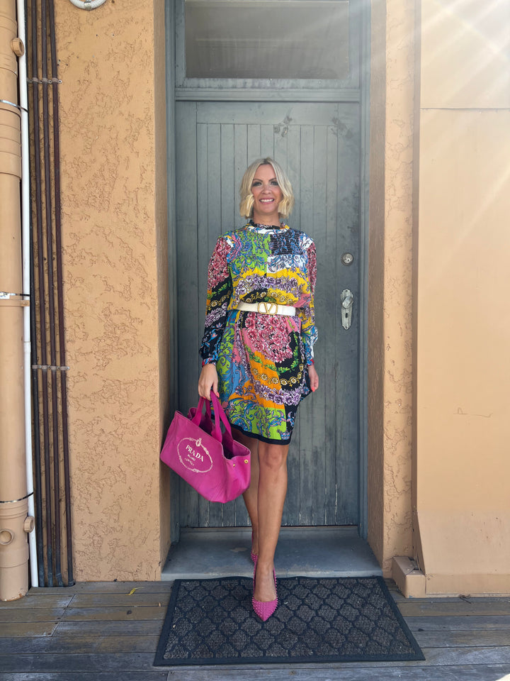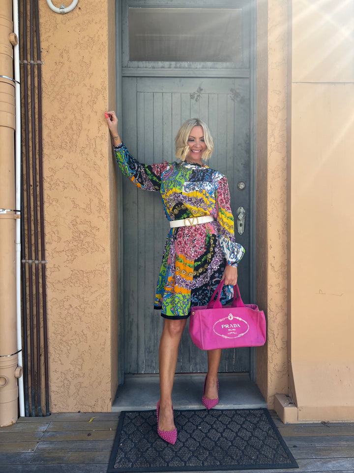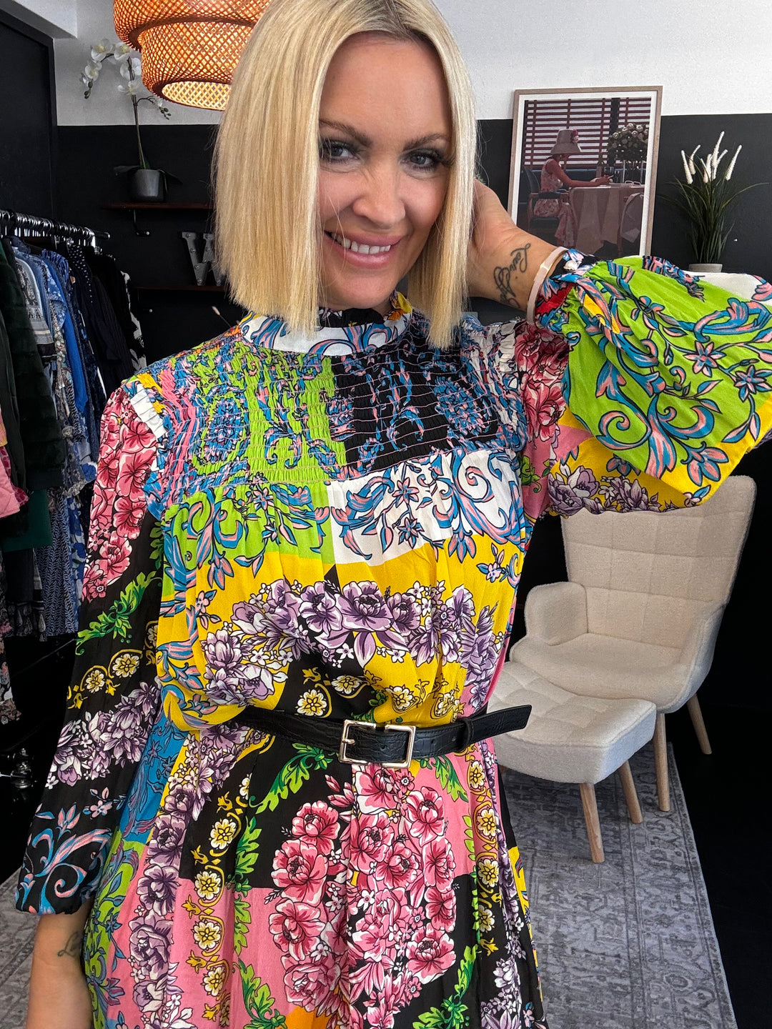 Perfect your wardrobe this season in the ‘Shirr Perfection’ dress. Crafted in the eye-catchingly bold ‘Living La Dolce Vita’ viscose crepe de chine, this playful dress is perfect for parties as the weather cools down. Featuring a flattering shirred yoke, a ruffle trimmed mandarin collar, and dramatic balloon sleeves. Pair with bright platforms for a fun party look.