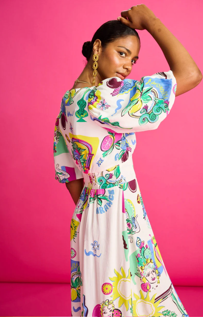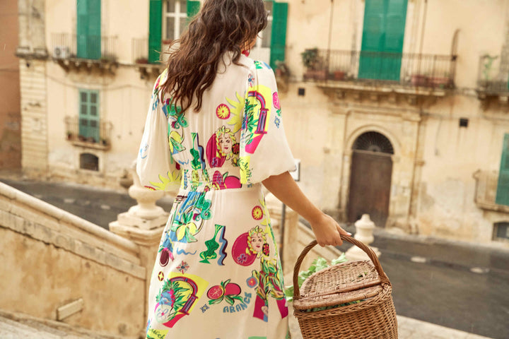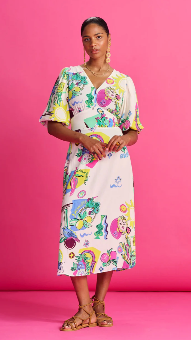 This white dress features hand-painted designs inspired by typical Sicilian elements. The dress has short puff sleeves, a flowy fit and is accentuated at the waist. The fabric blend with LENZING™ ECOVERO™ makes this a more sustainable item.