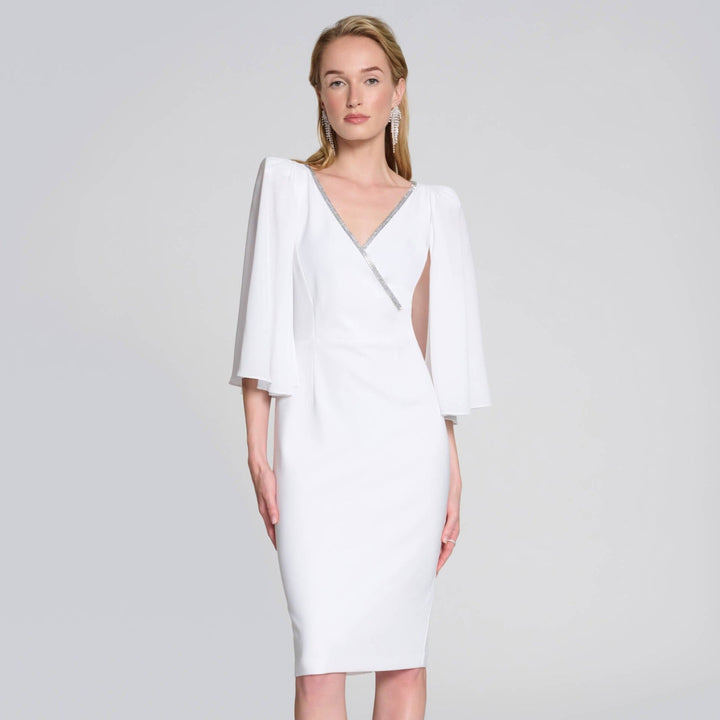 Experience the allure of this solid fused silky knit dress. Its wrap neckline dazzles with rhinestone trim, complementing the three-quarter length statement georgette sleeves that feature shoulder pads for added flair. An invisible back zipper guarantees a seamless fit, while the below-the-knee length and lining embody elegance and grace.