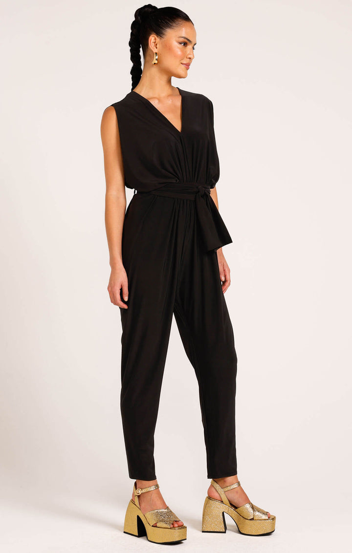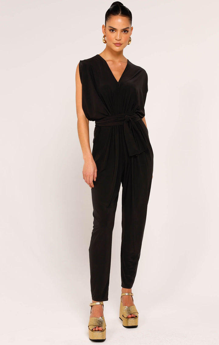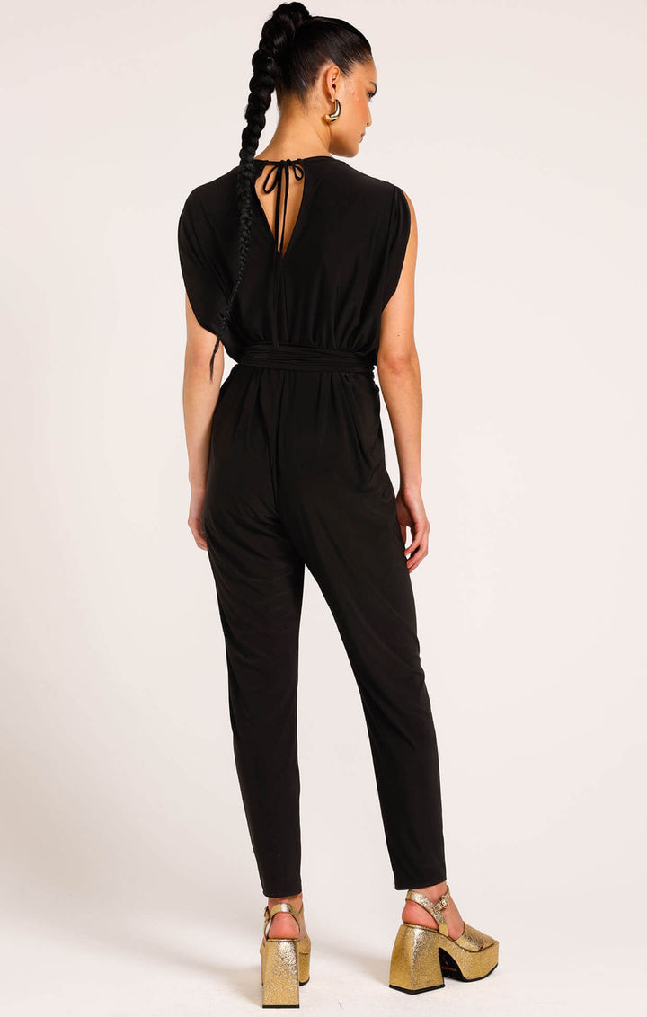 Look no further than the Solange Jumpsuit for the perfect all-rounder! This jumpsuit offers a loose fit that is comfortable and flattering in its premium stretch jersey fabric. Step into this style through the neck and pull up over the body fastening the tie behind your neck. You can then tie this as loosely or tightly as you like to achieve your desired sleeve length. Wear loose for a relaxed fit and feel, or use the detachable tie belt to create shape. Perfect for work, weekends, lunch with the girls, or take on your next vacation as you don't have to iron. This style can also be dressed up with heels for many events.