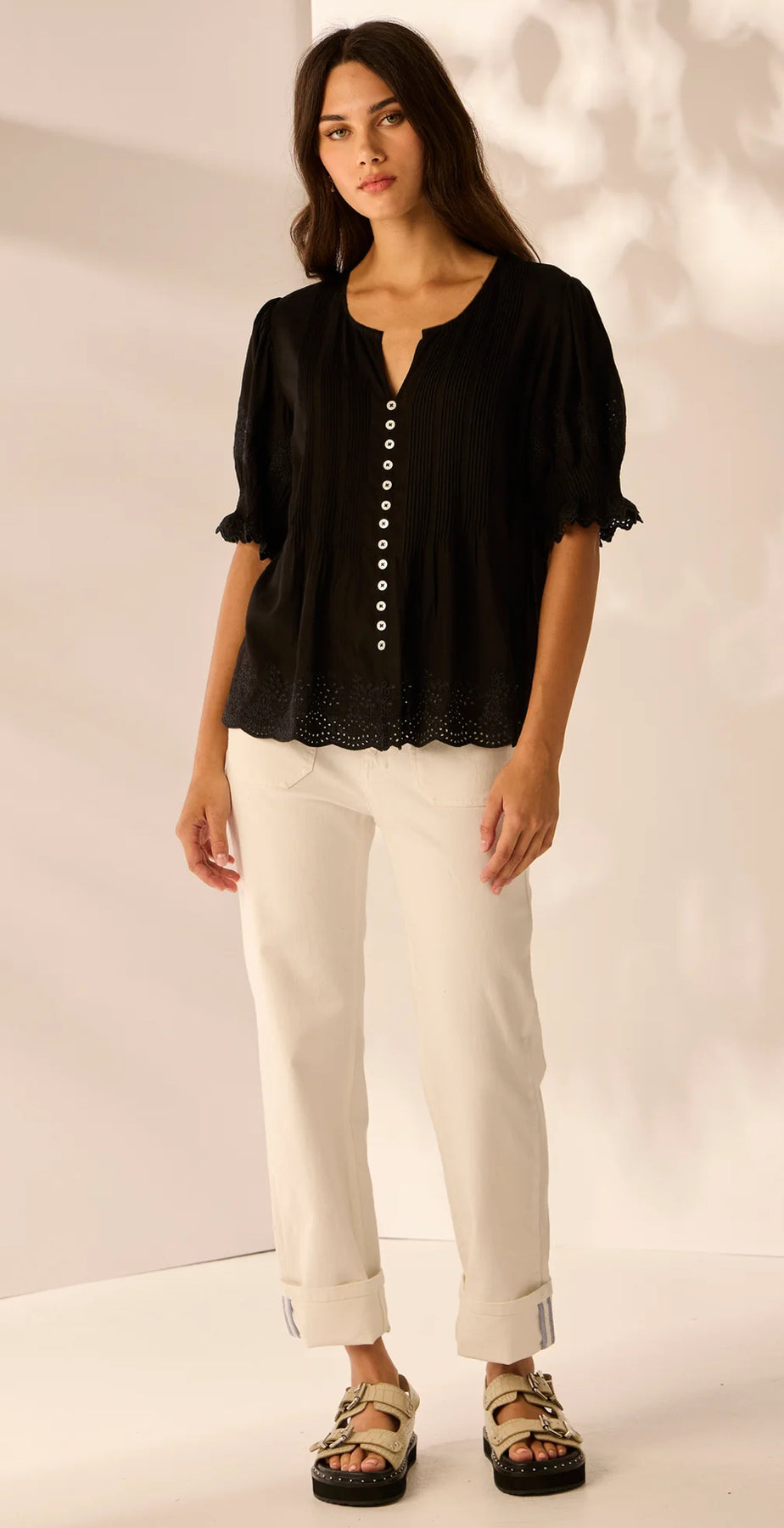 Embrace elegance with the Clover Shirt, crafted from a soft linen/viscose with a faux button through design. Enhanced with delicate pin-tuck detailing on the front, back and cuff. Embroidered design with scallop edge around the cuff and hem adds a touch of femininity.