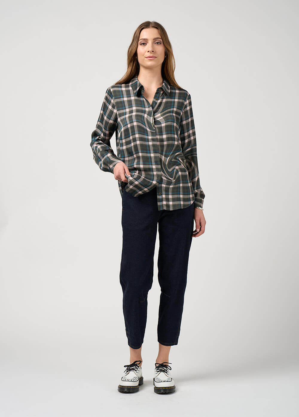 Chosen for you,this funky printed button-through collared shirt, in a very soft viscose. The curved hem makes to flattering on the tummy. Bringing a cool twist to smart casual.