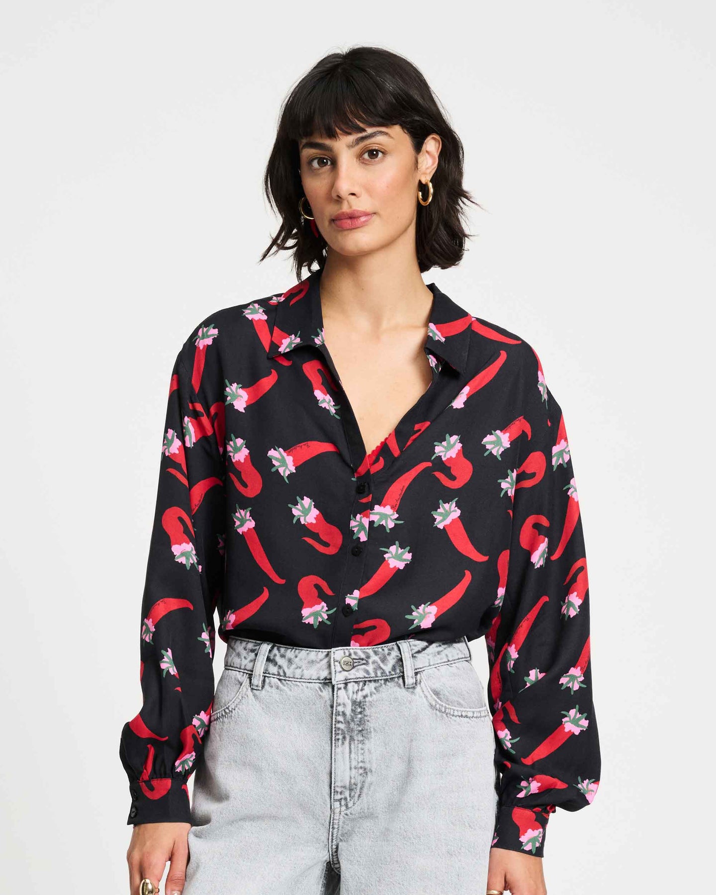 • Black/Red/Fuchsia/Green • Pepper print • Classic collar • Long sleeves • Straight fit • Button placket at the front