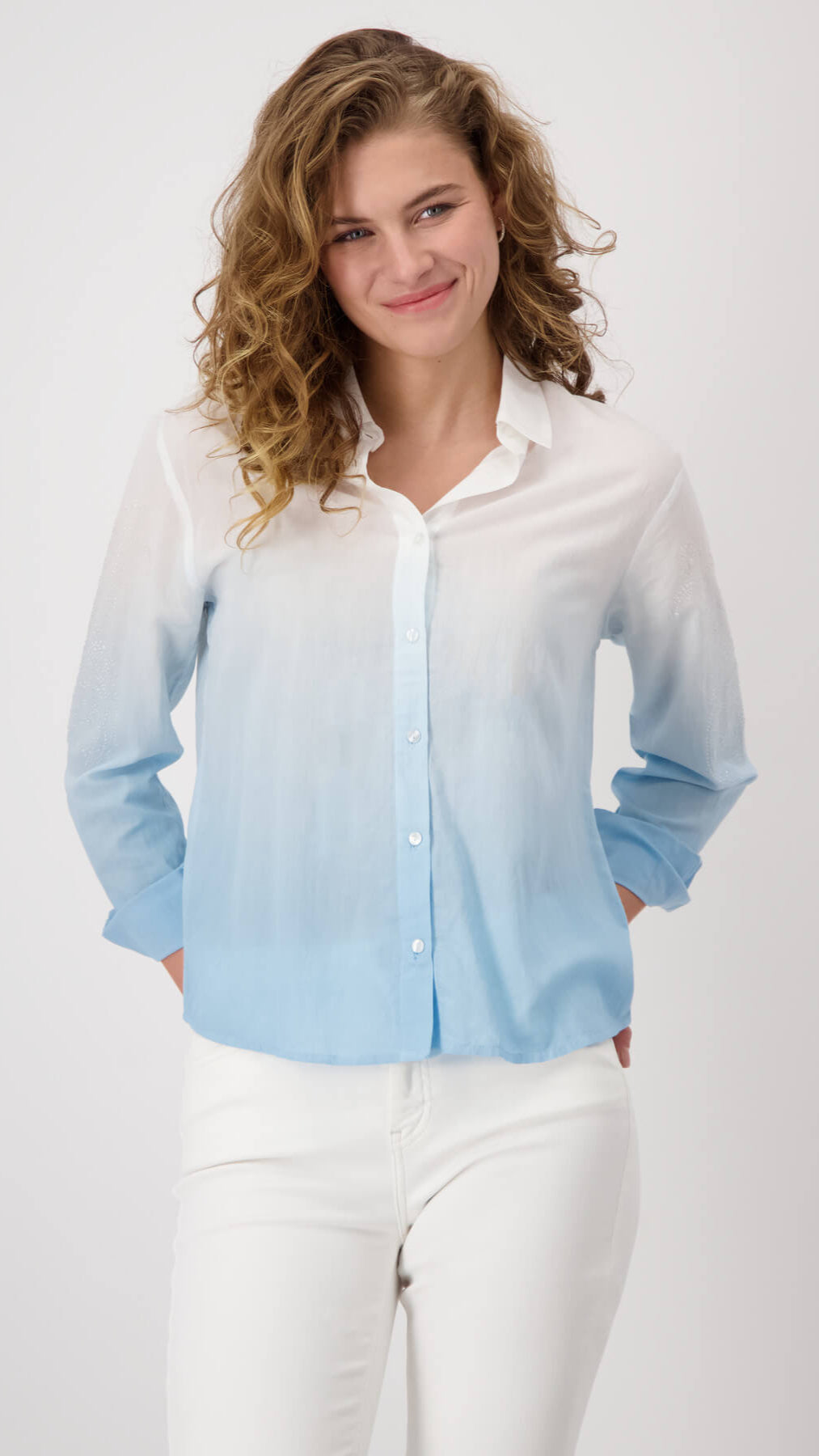 This batik shirt in cotton and modal is decorated with transparent rhinestones on the sleeves. The shirt collar and the extended, rounded front give the shirt a stylish touch.