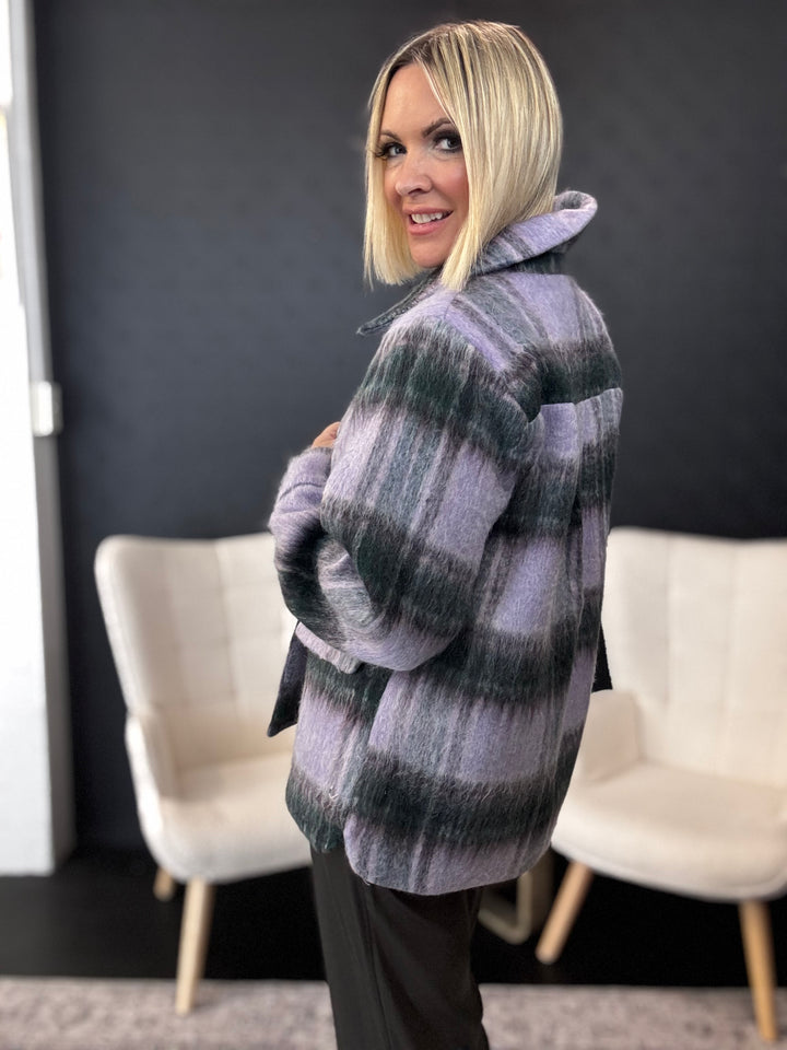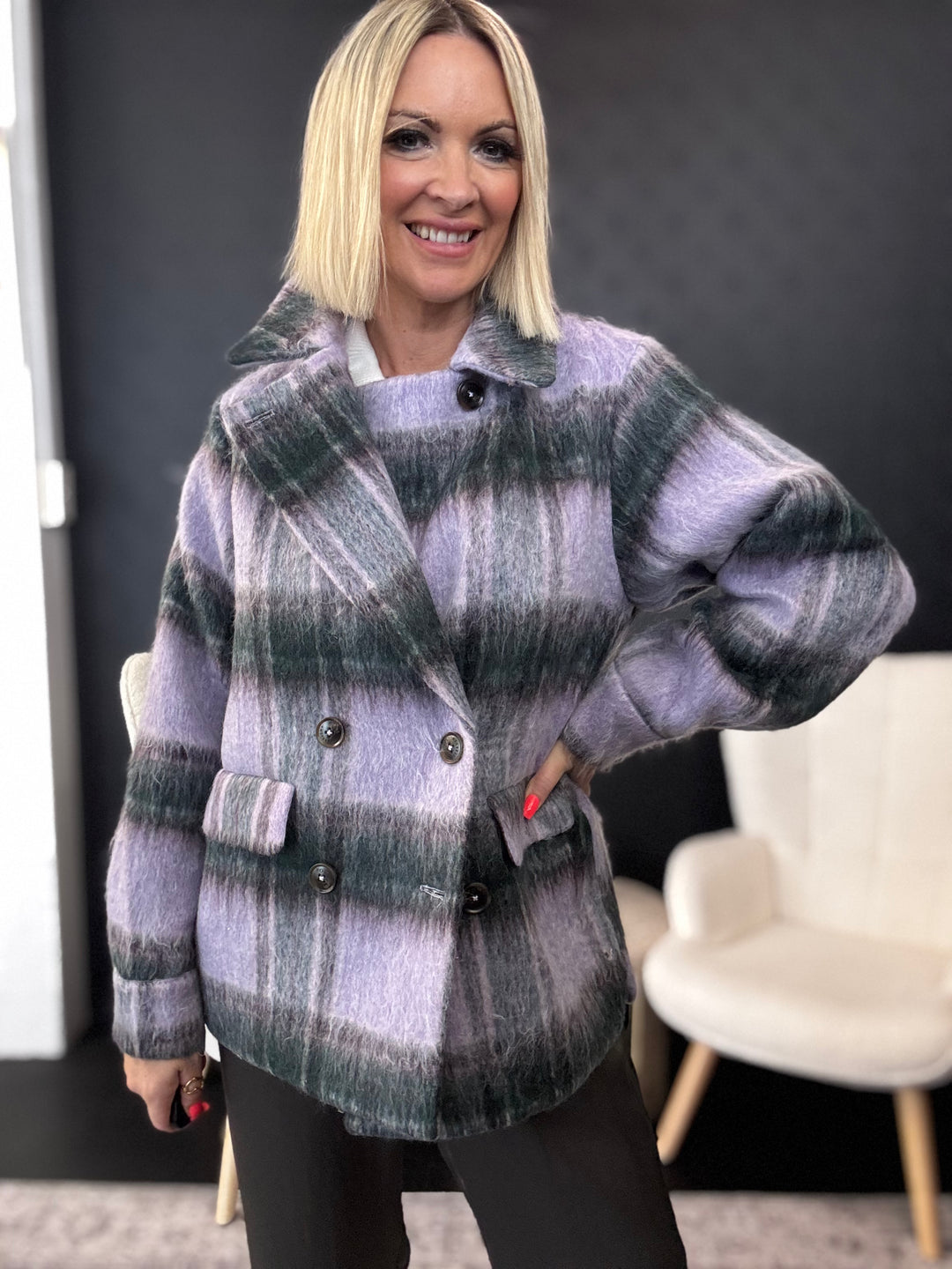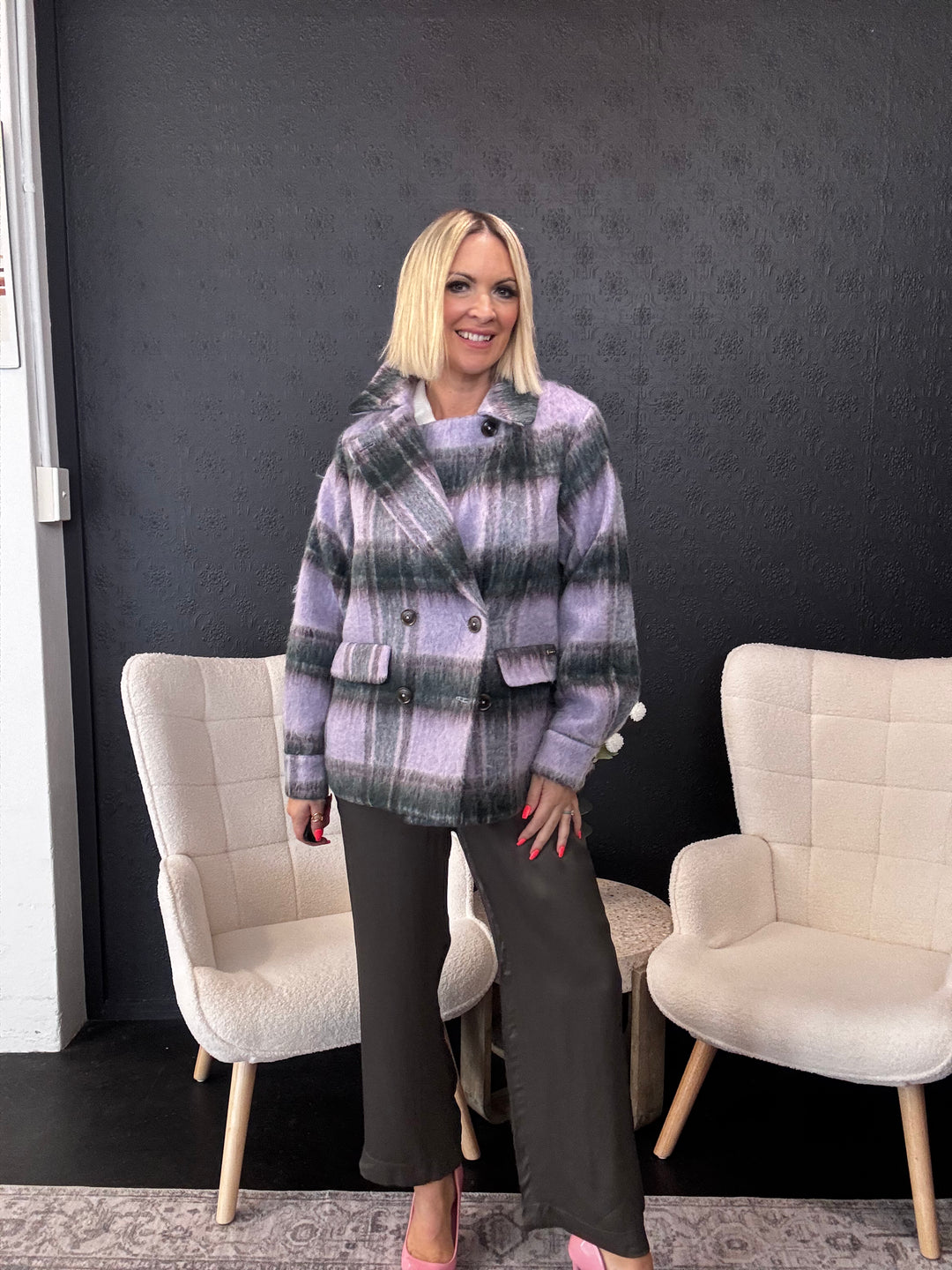 Meet our purple jacket. This jacket has a classic checked print and is made of a furry fabric, making it perfect for autumn. •Purple coat