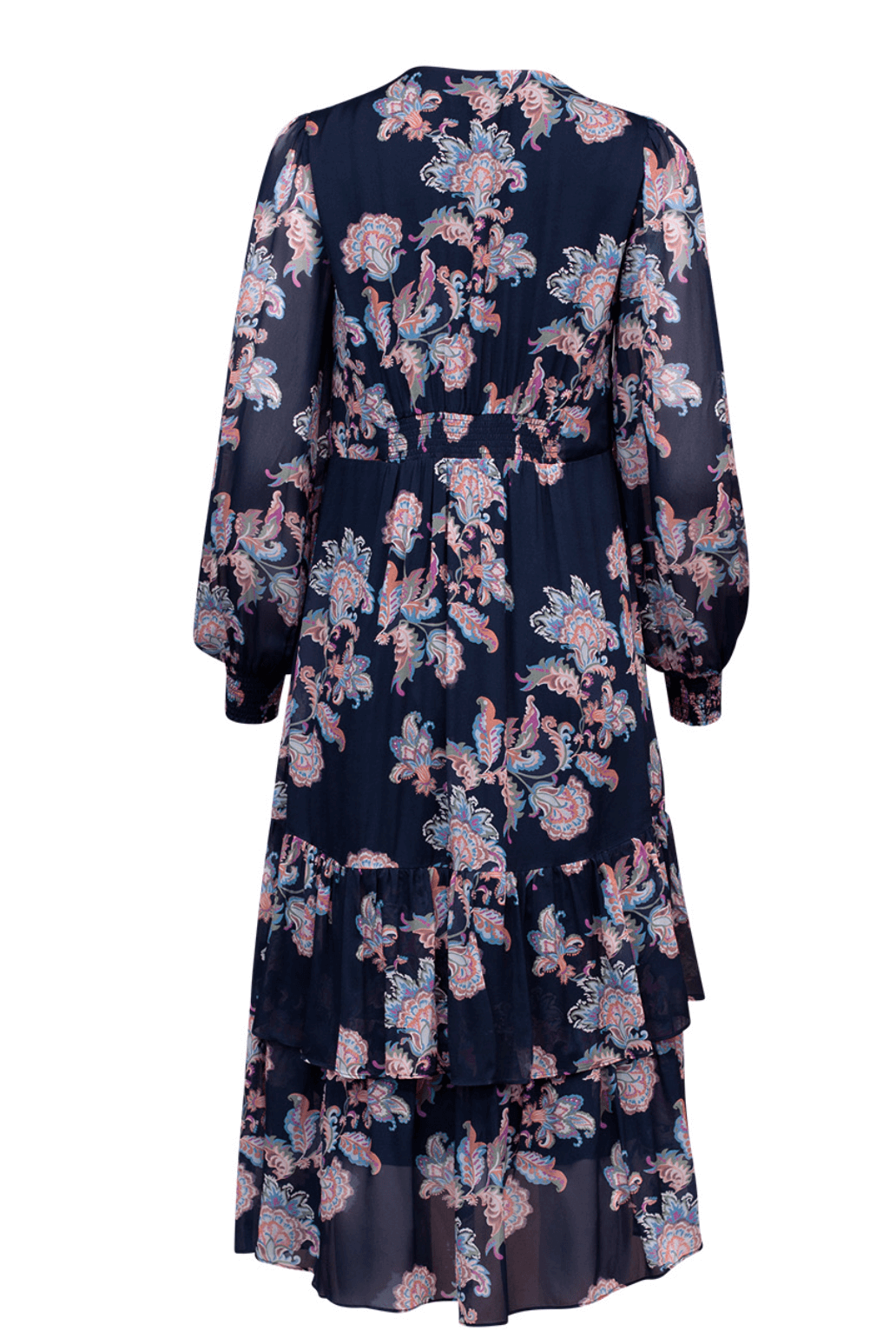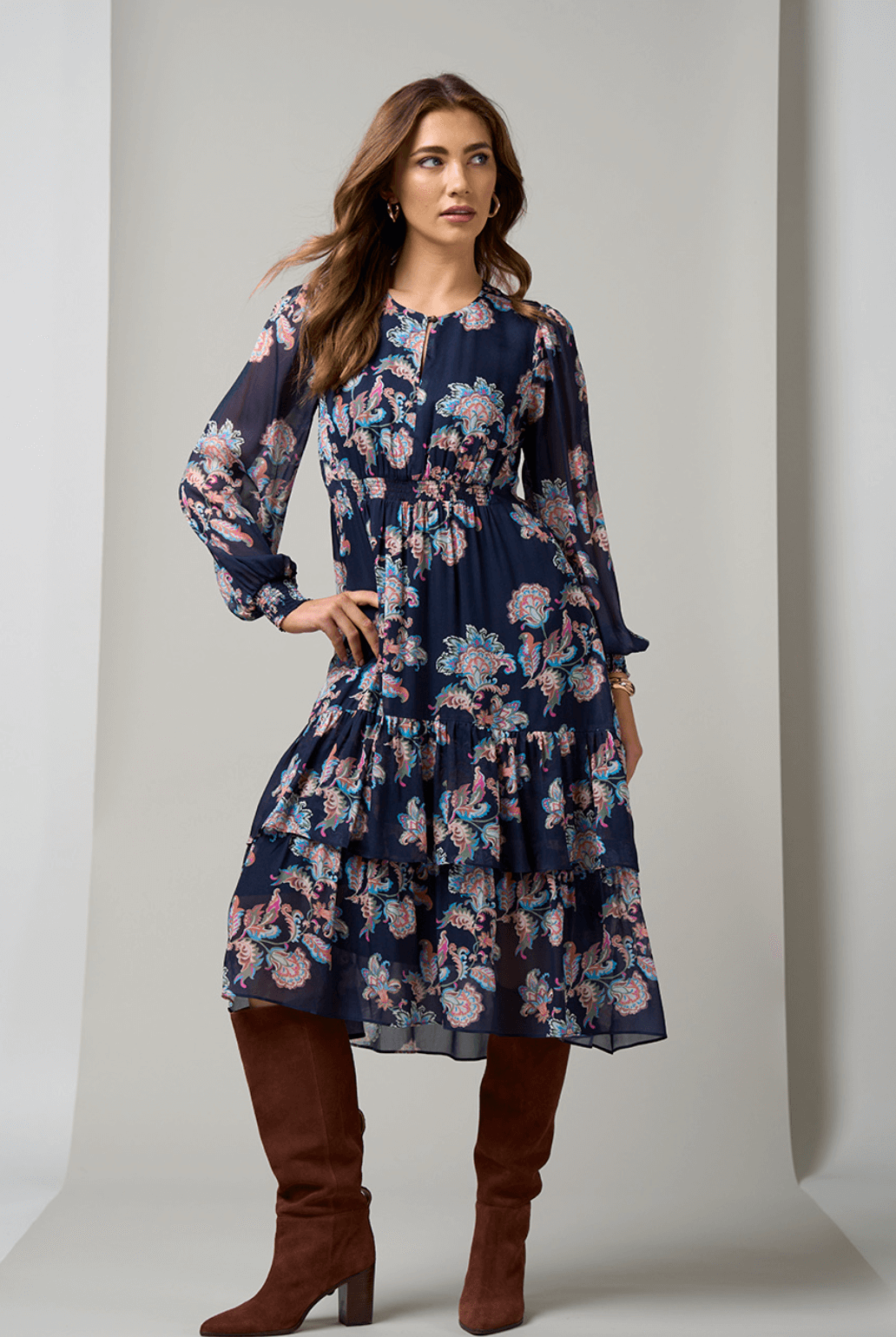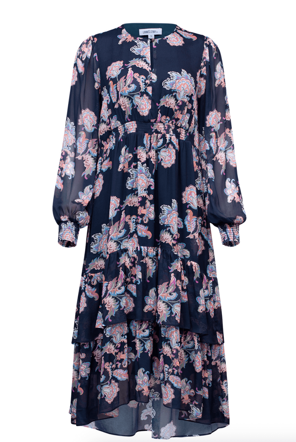 Floaty dress, with a keyhole neckline which can open to a V-neck style. With blouson sleeves and layered hem tiers, featuring shirring detail under the bust, with shirred elasticated cuffs. Fully lined.