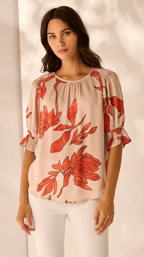 Welcome effortless elegance with the Chino Top—a beautifully detailed essential blending comfort and style. Featuring an exclusive in‑house print, delicate shirring at the raglan shoulder, and soft gathering around the neckline framed by refined binding. Elbow‑length sleeves with half‑elasticated cuffs introduce gentle volume, completing the look with understated charm.