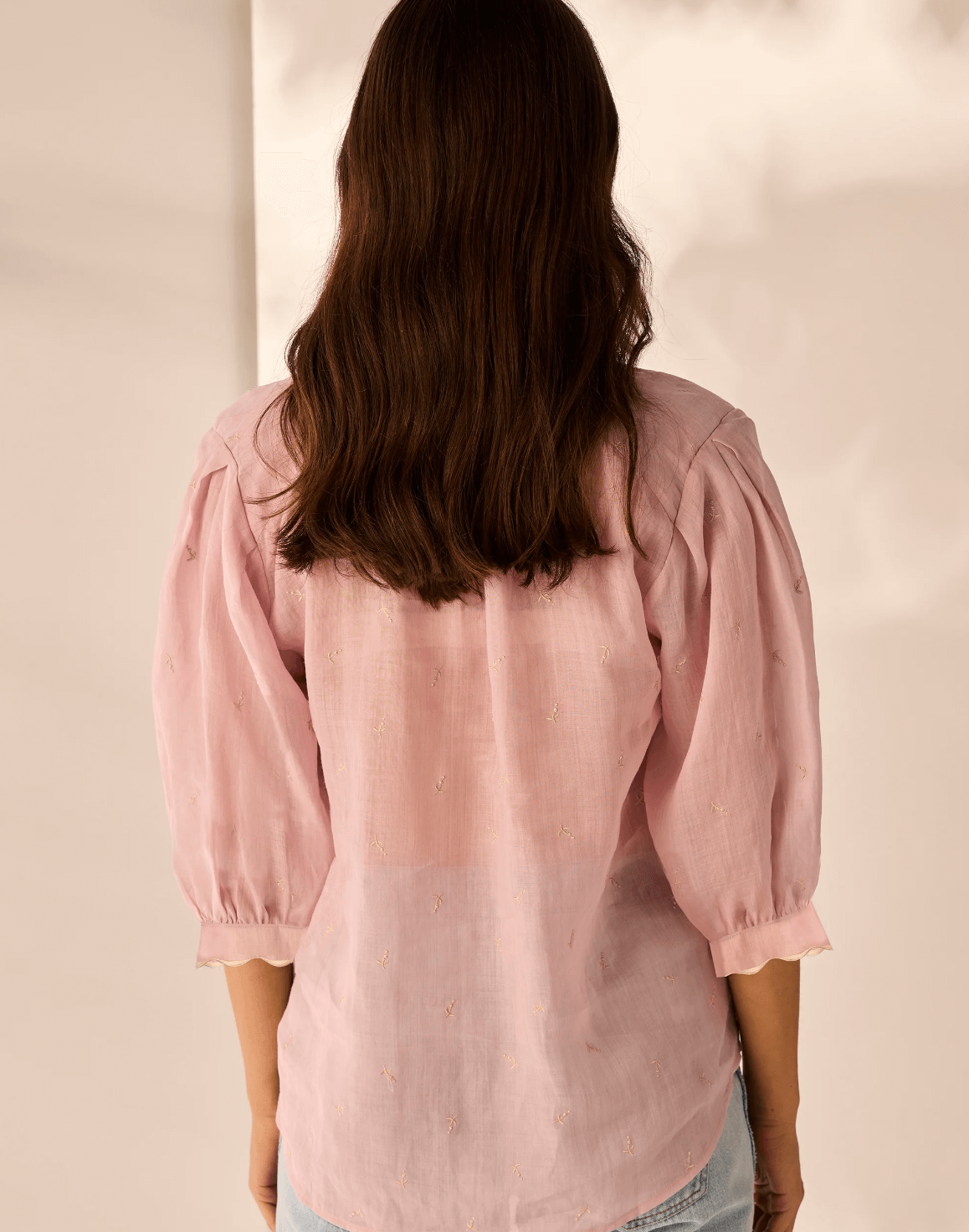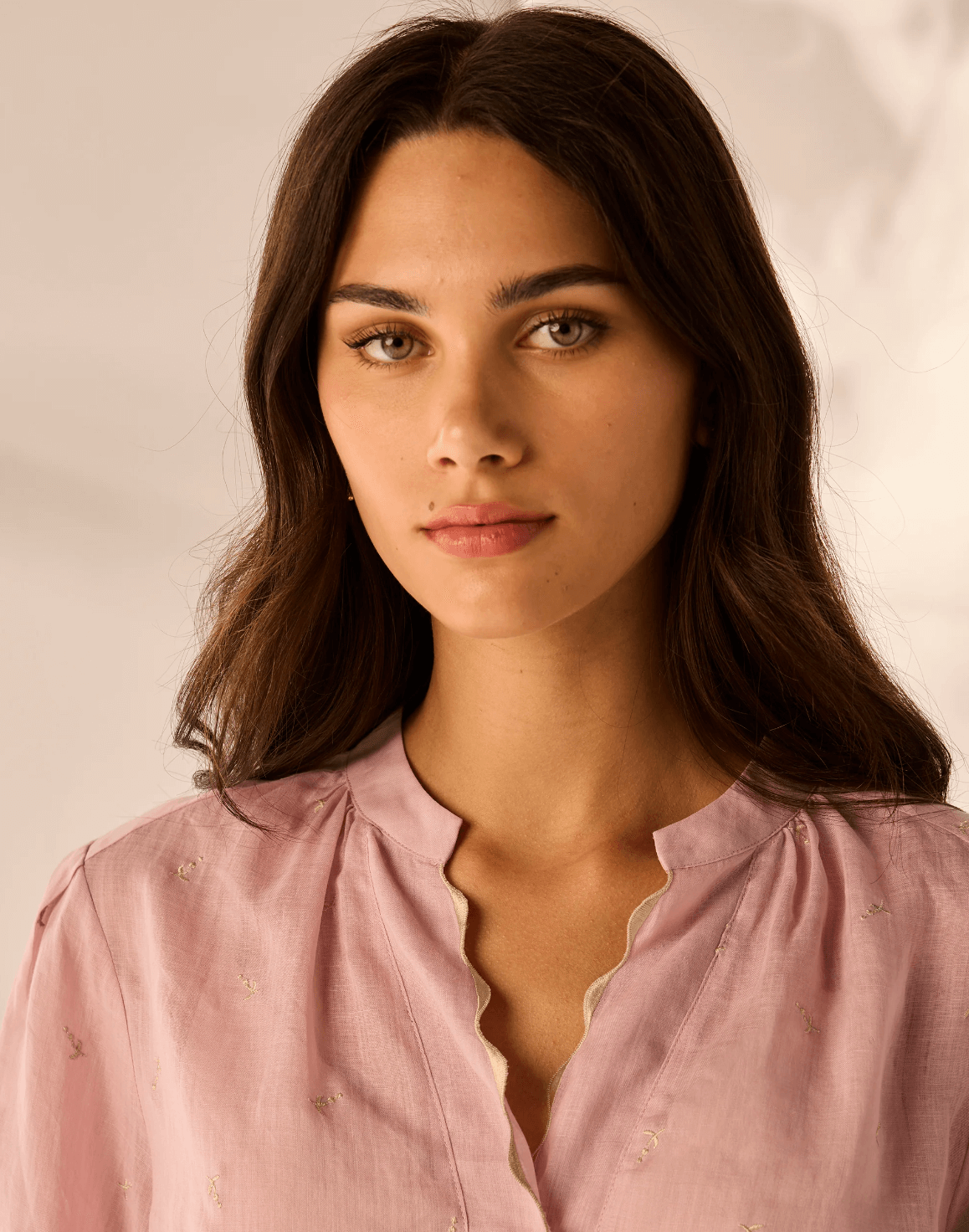 An embroidered Ramie fabrication takes form in a relaxed fit shirt. The soft gathered neckline, glass/ natural round buttons and scallop embroidery border down the centre front placket and cuff all contribute to the refined femininity of this style.