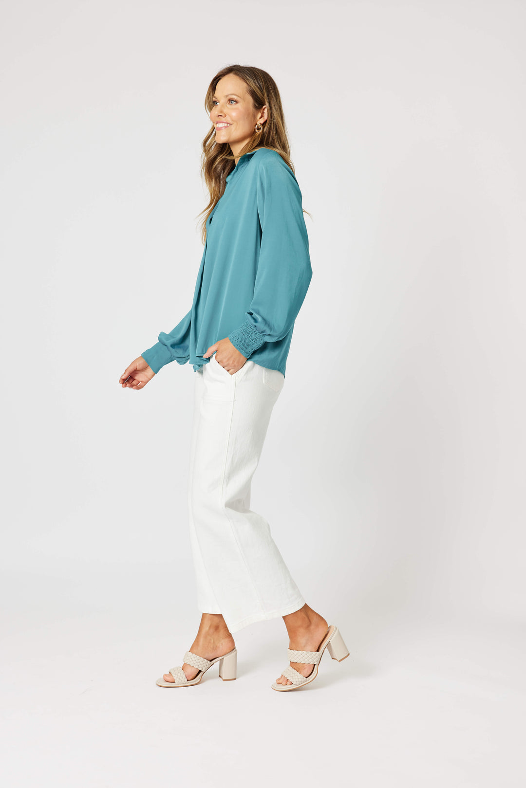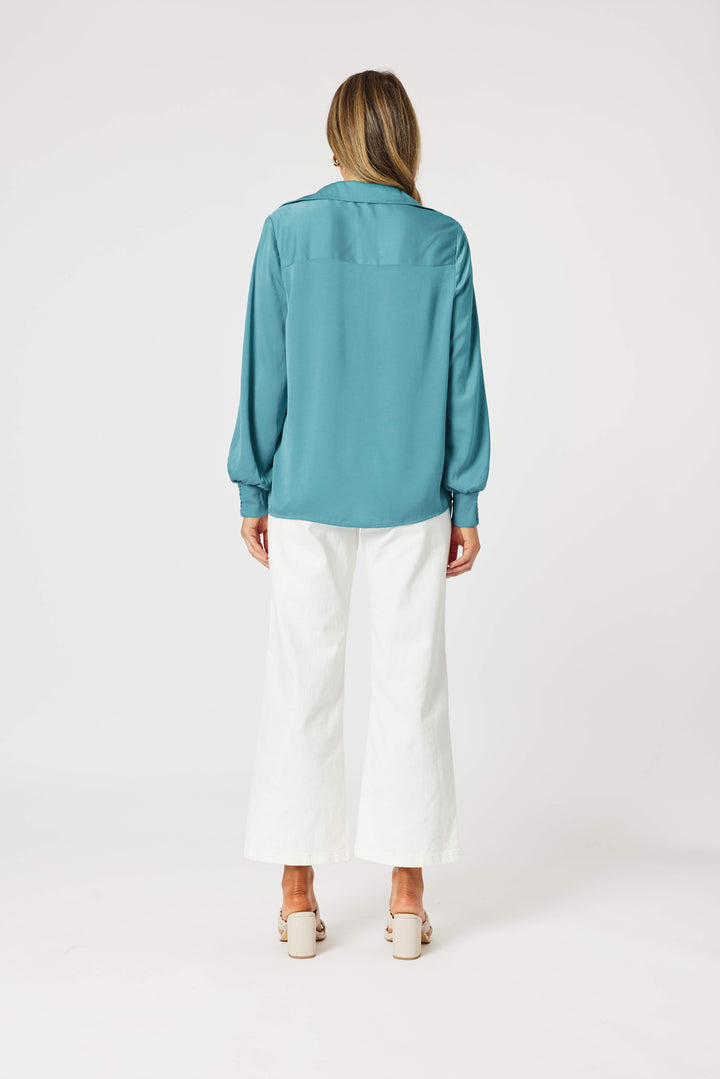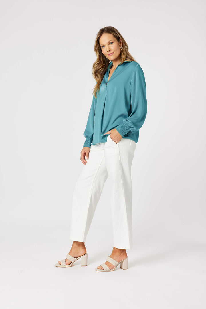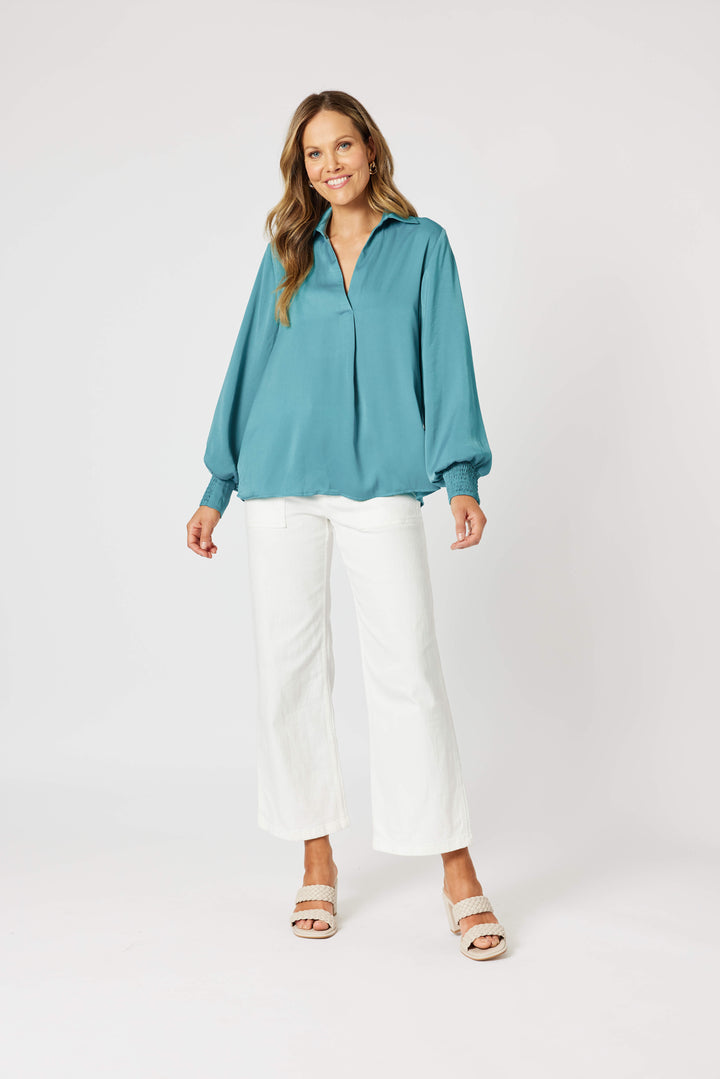 - The elegant collar and V-neckline add a touch of sophistication, while elasticated cuffs offer versatile styling options.