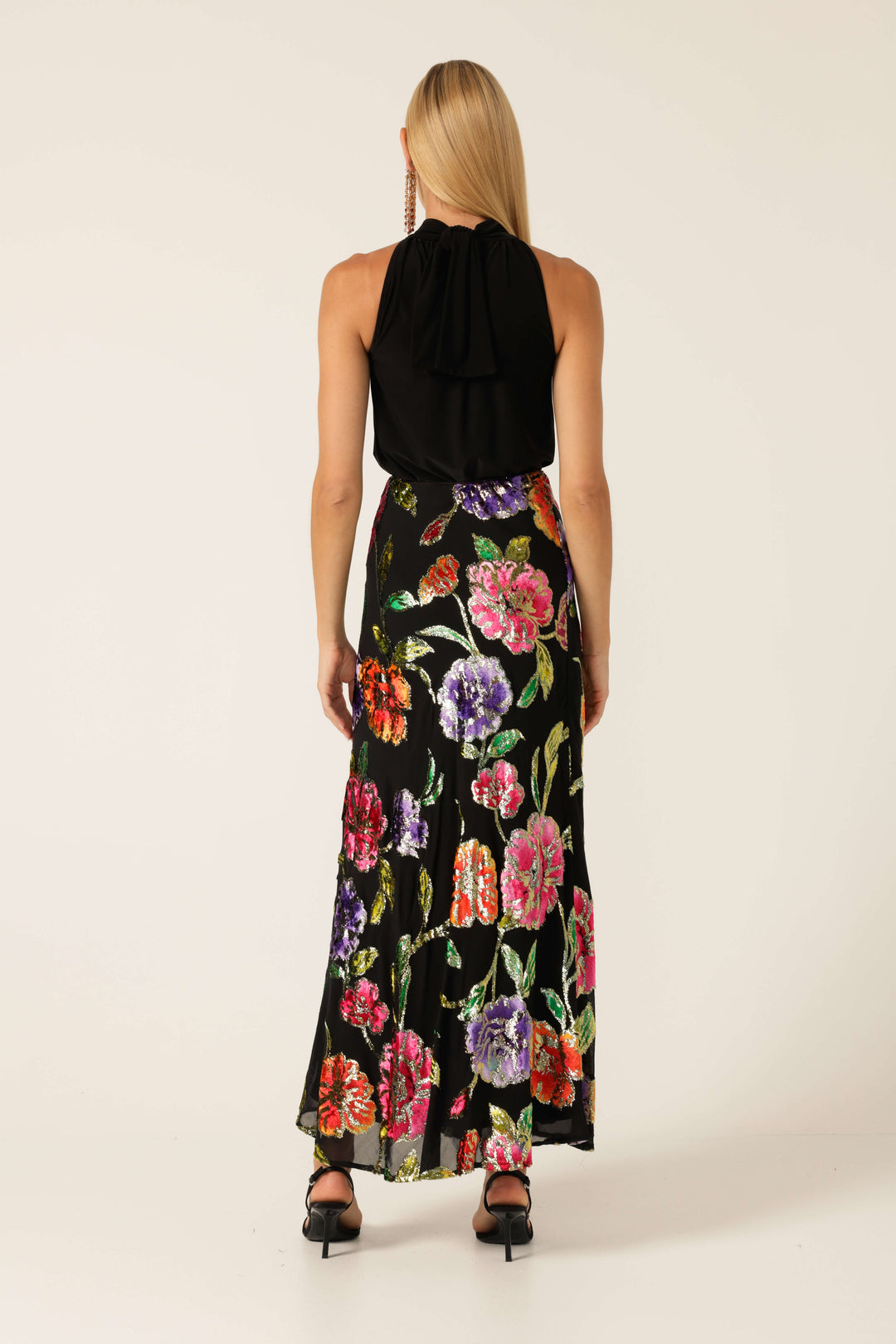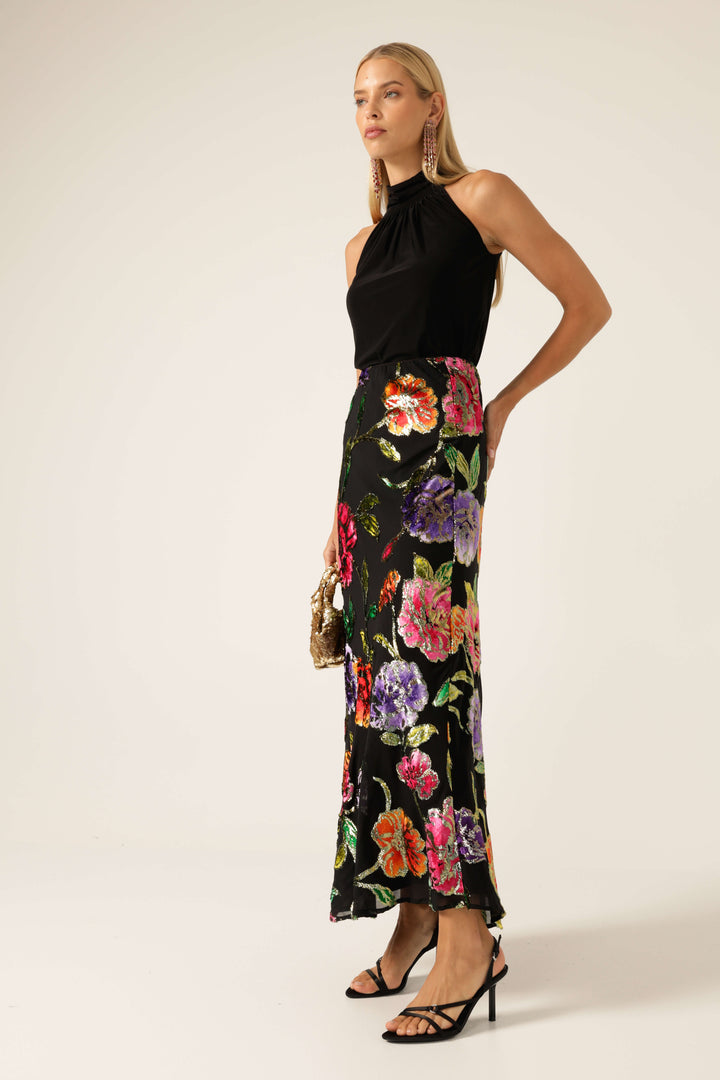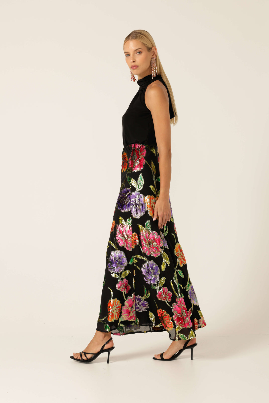 The Night Flower Bias Skirt by Sacha Drake at The Wardrobe is made from luxurious silk chiffon with a vibrant floral print and a flowing maxi length. Designed for effortless elegance, it features a flattering bias cut, an elasticated waist for comfort, and a smooth satin lining—perfect for weddings and events