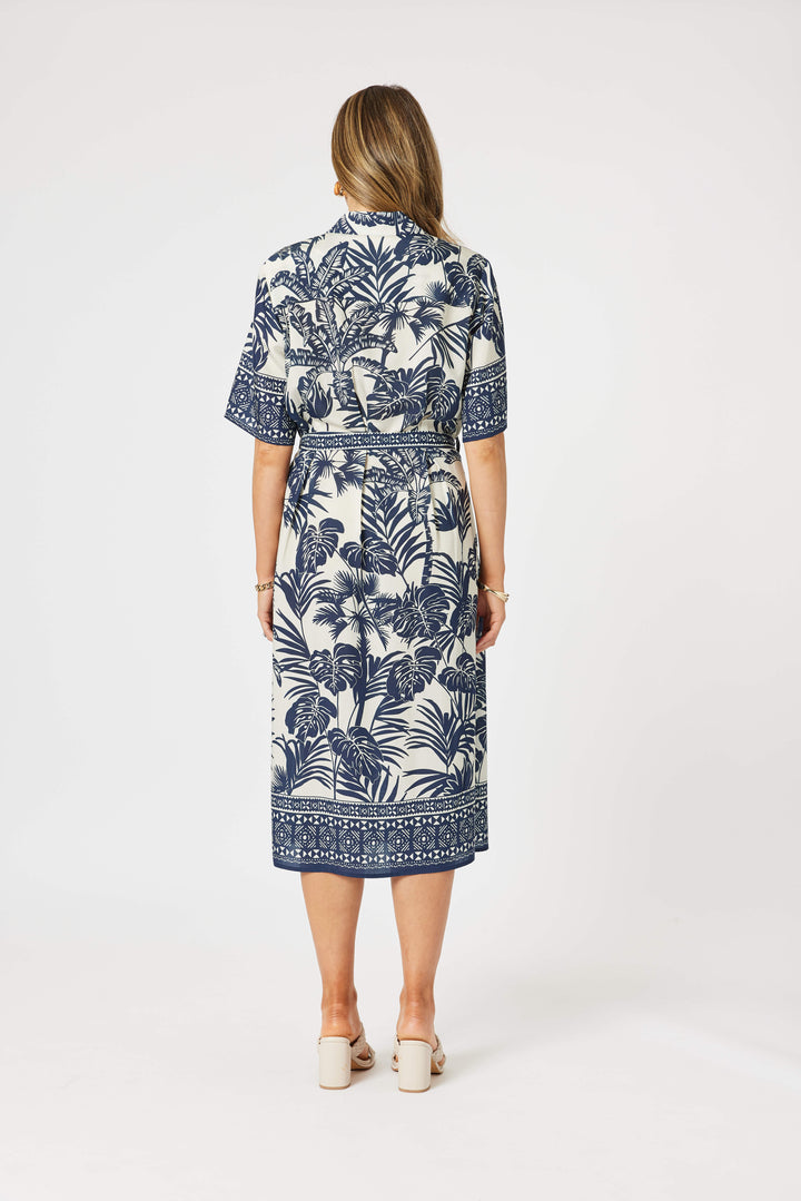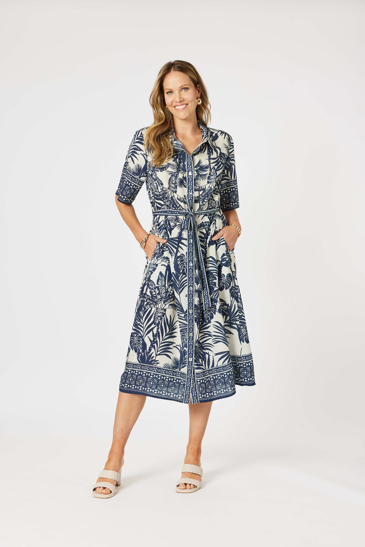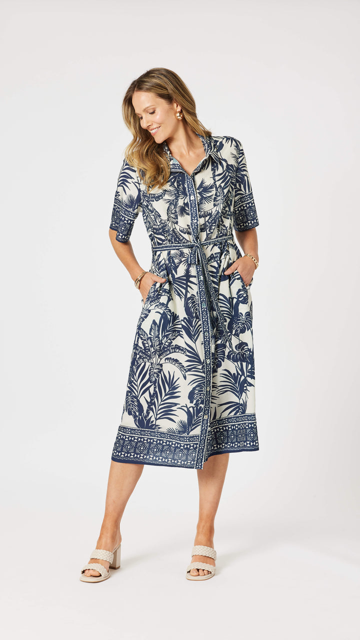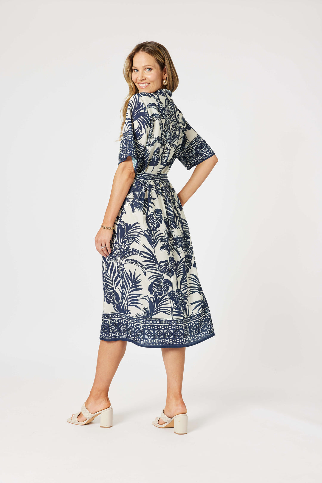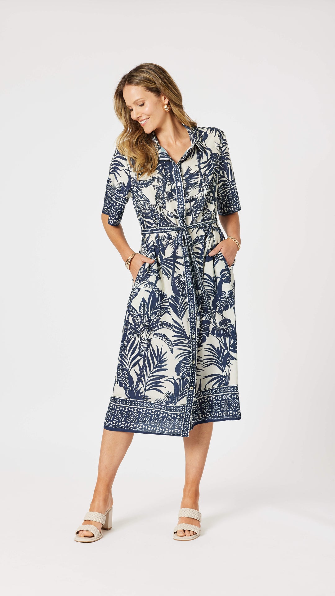 - Featuring a tropical palm print in a classic navy and ivory palette, this midi-length dress has short sleeves, a self-tie waist belt for flattering shaping, and practical side pockets.