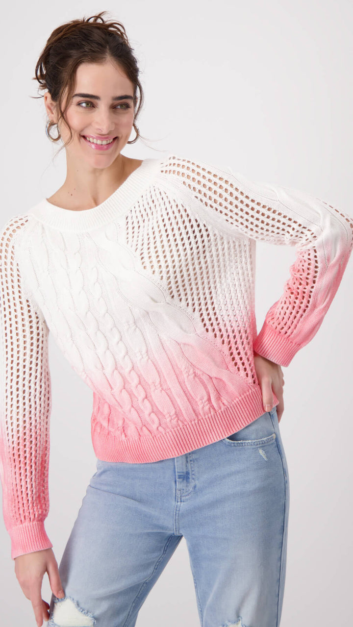 The cotton jumper impresses thanks to its modern colour gradient and amour structure with cable stitch. |
