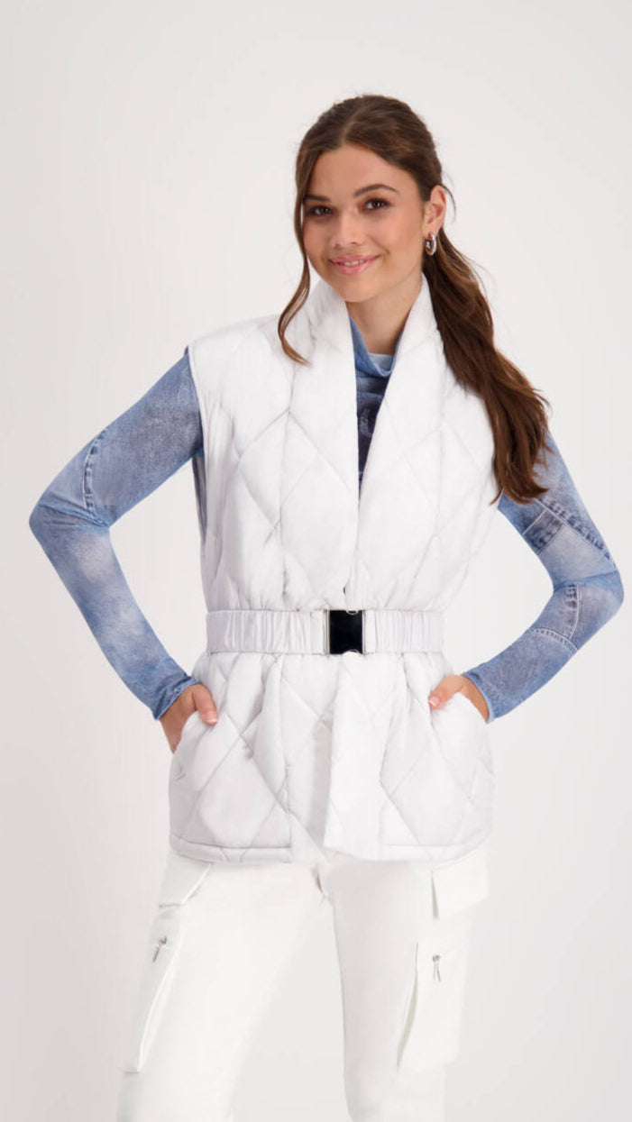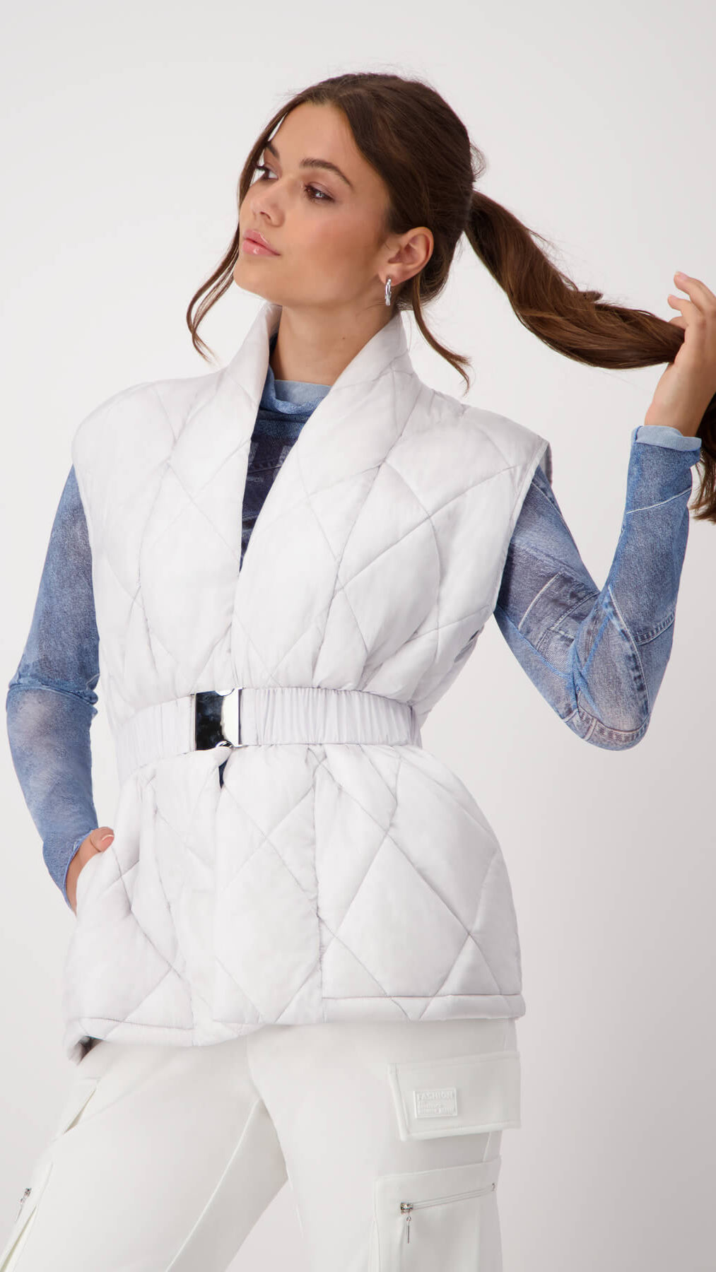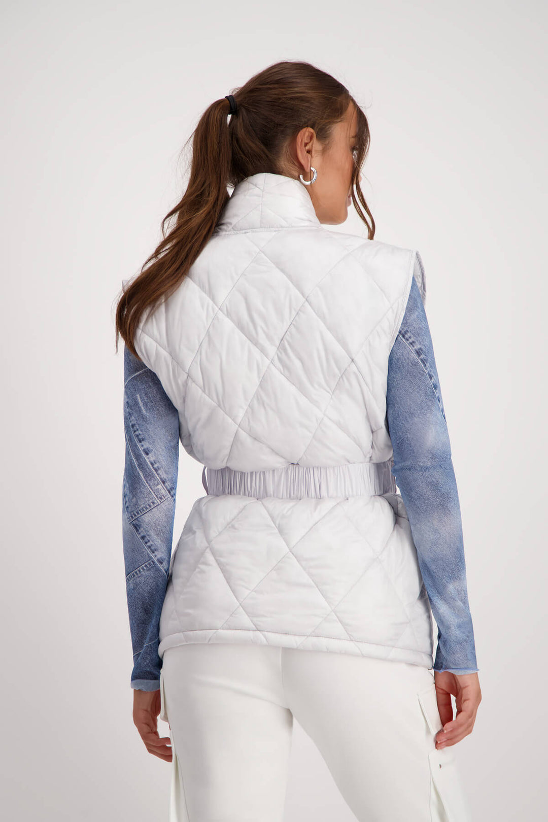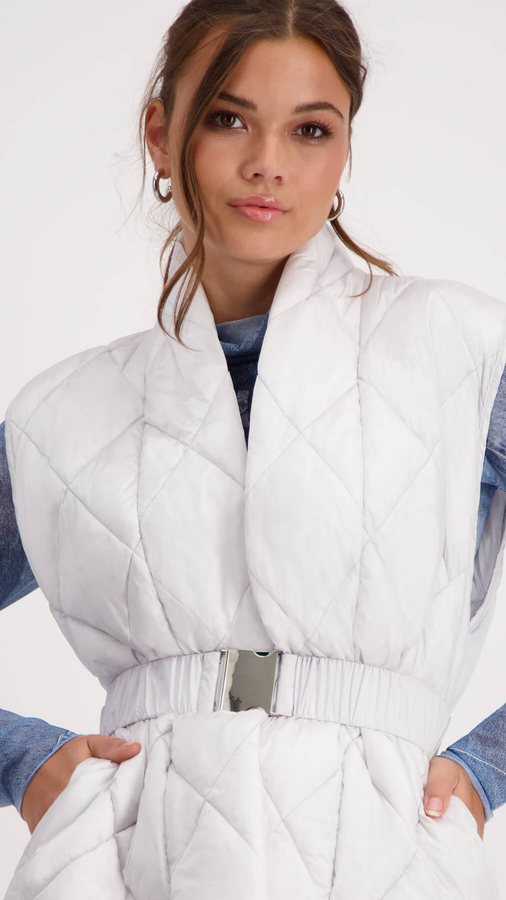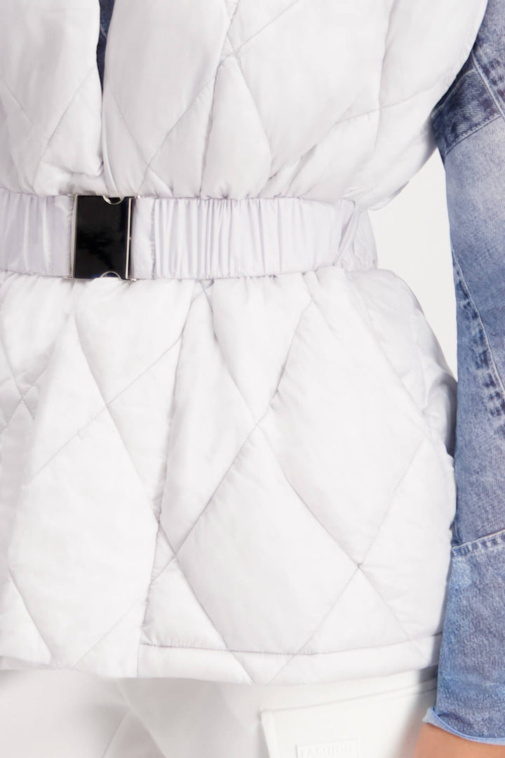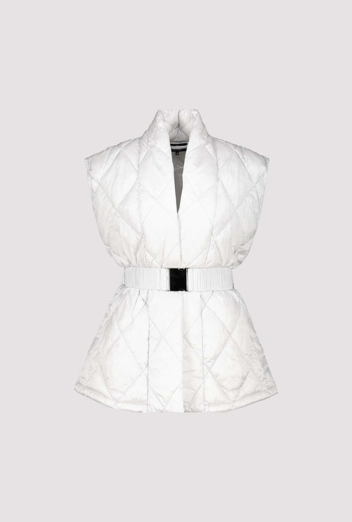 The shiny quilted gilet features a shawl collar. In addition, an elastic waist belt with buckle ensures a perfect fit.