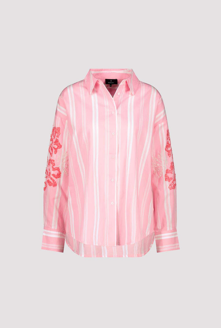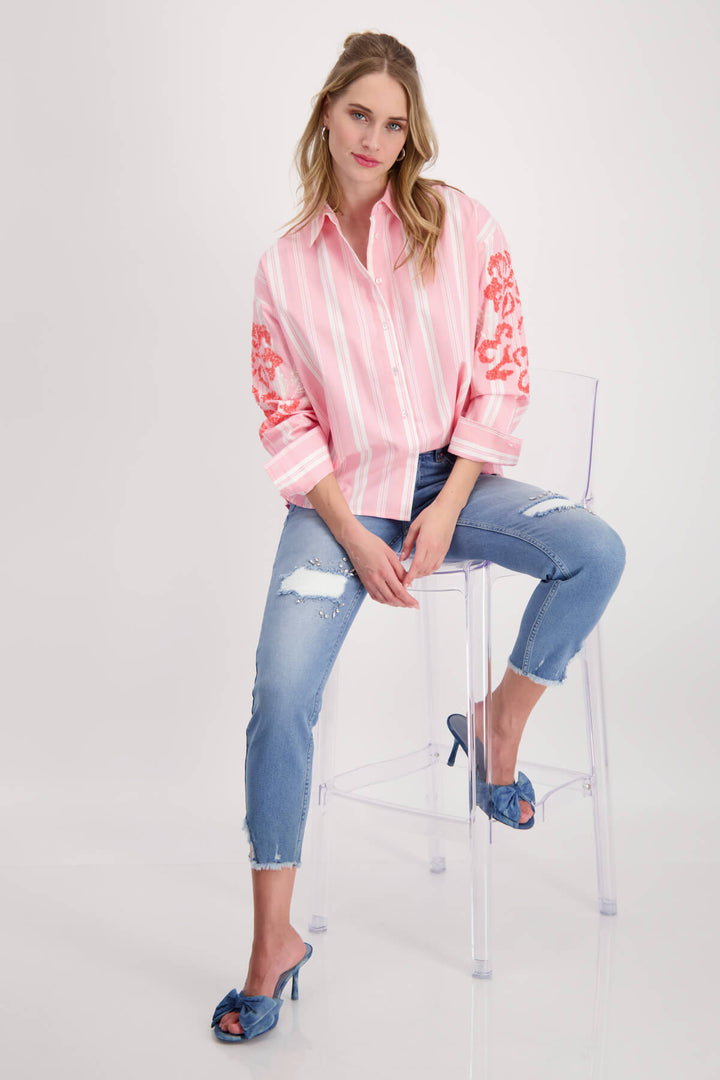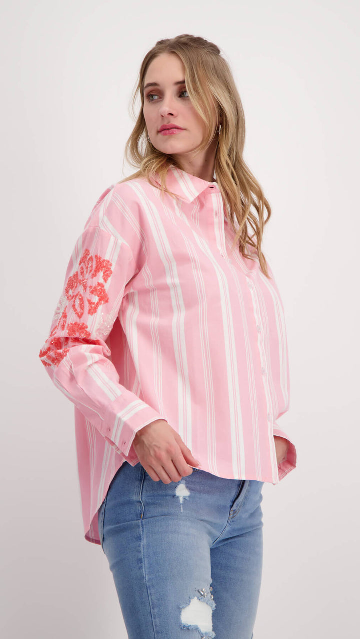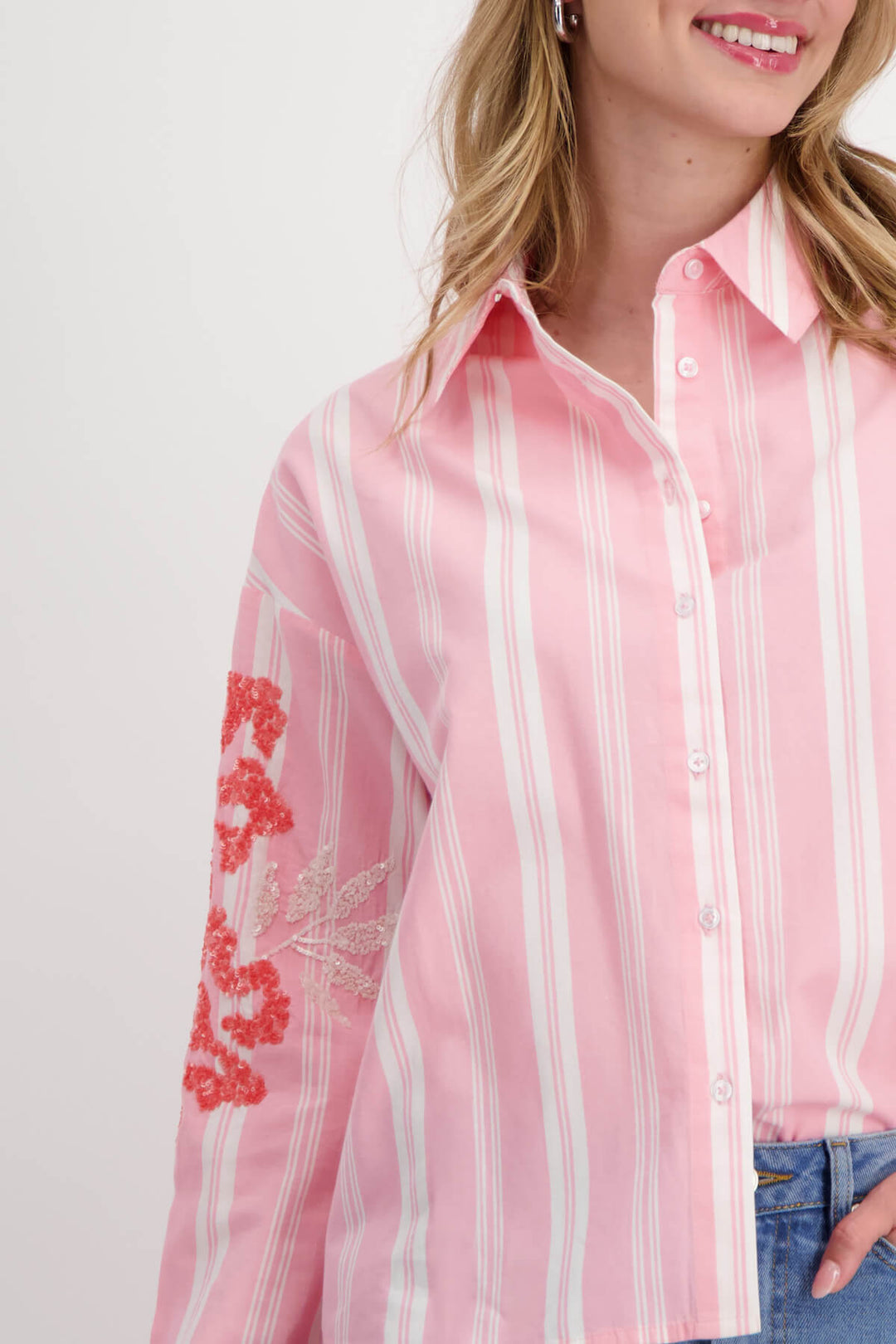 100% CottonThe beautiful blouse is made of 100% cotton and has a striped design and sequin flowers. on the long sleeve.