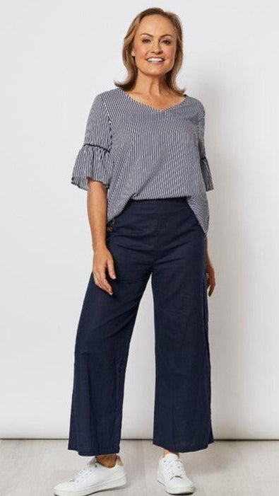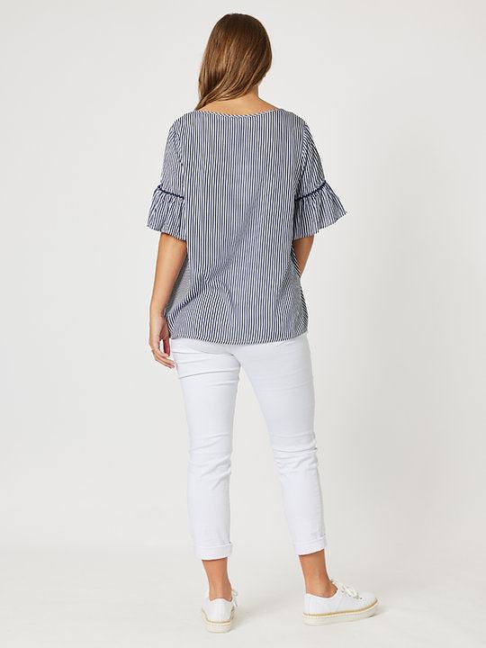 - Elbow length sleeve with ruffle cuff and navy ric rac trim on seams