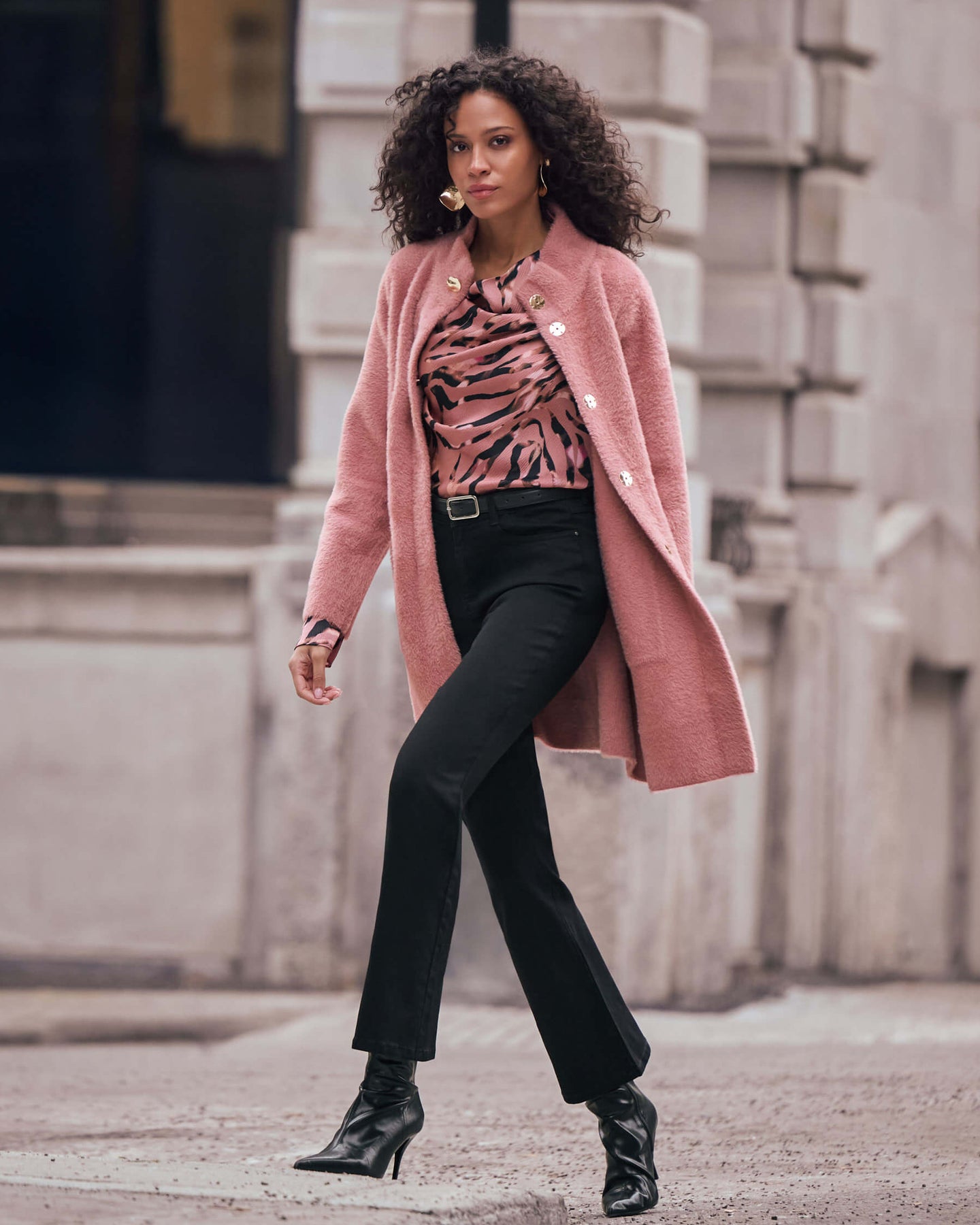 You'll love ... This textured satin top lets a wild side surface elegance, blending fluid drape and a sculpted cowl for a confident, evening-ready statement or for work wear.