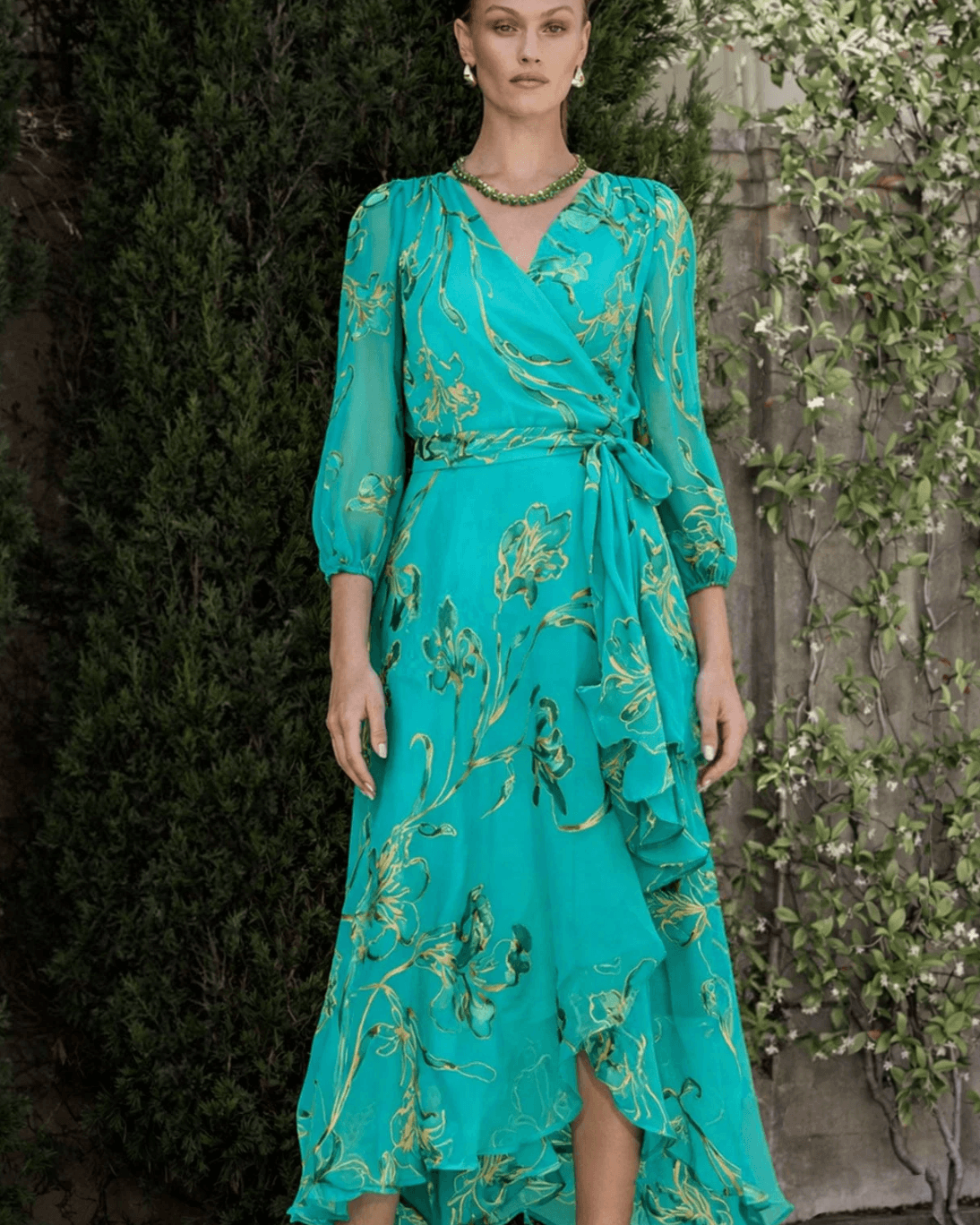 The Lorelei Wrap Dress is made from luxurious silk-rayon burnout fabric in an exclusive print, featuring our iconic wrap silhouette with a bloused sleeve and hi-lo midi hemline. Fully lined for comfort, this statement piece is perfect for weddings, formal occasions, and evening events.