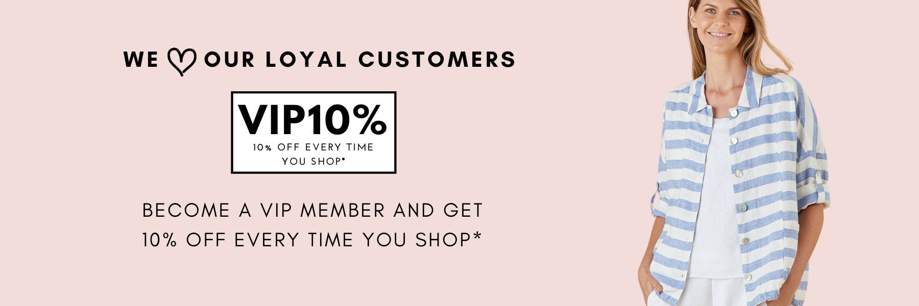 Sign up to VIP10 for our fashion updates and promotions and log into your account, and receive 10% off all brands* - every time you shop! (*Offer applies to full priced products.)