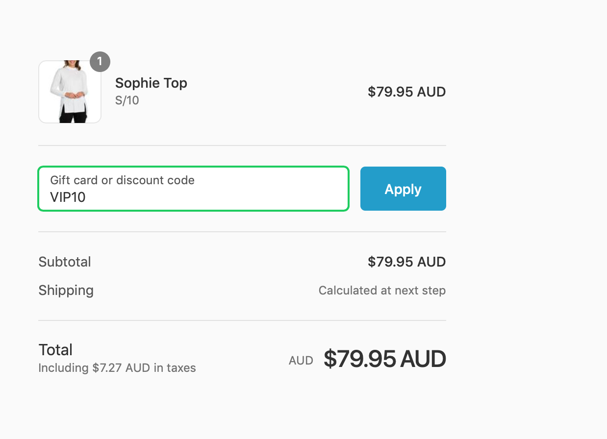 To redeem your VIP10 discount code, simply add the item/s you would like to purchase to your cart and continue to checkout by clicking the 'Check Out' button. You will then be directed to a page containing a coupon box, where you can insert your discount code. Click 'Apply' and your VIP10% will be deducted from the order total.